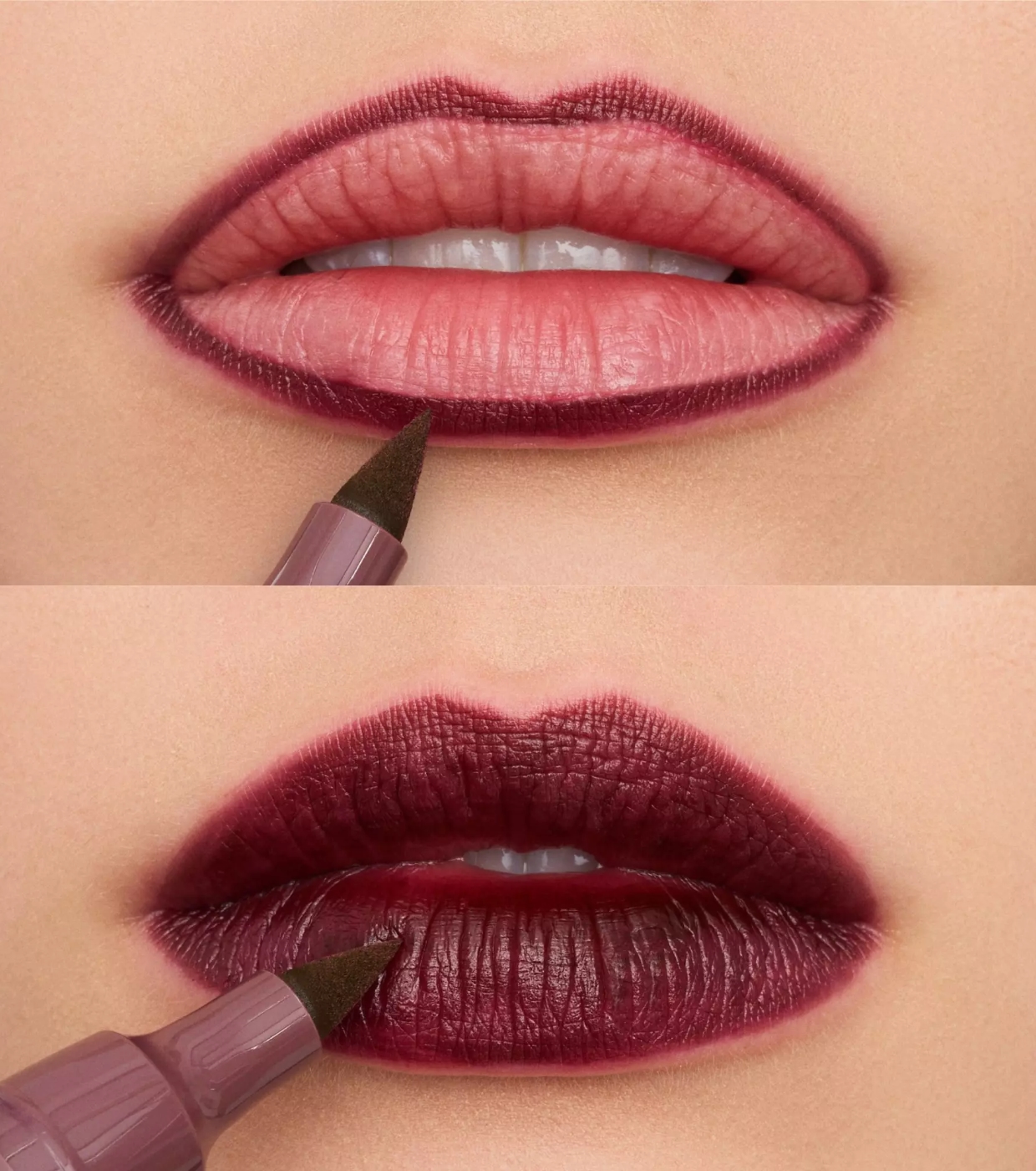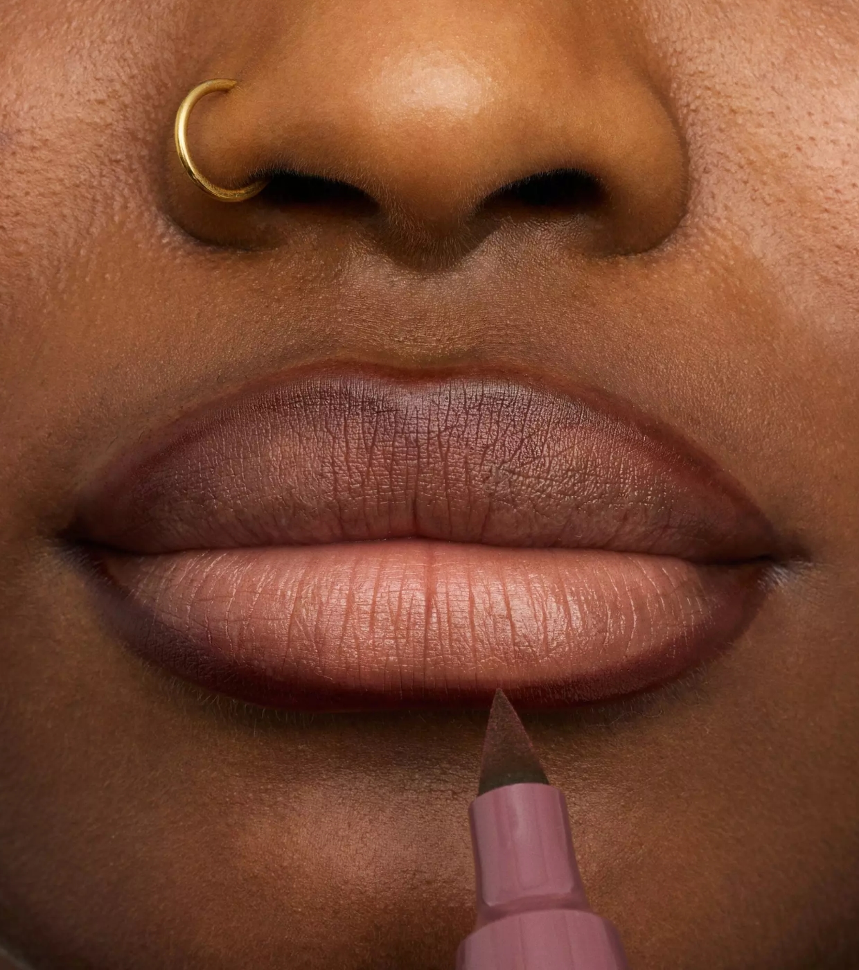 Le crayon à lèvres liquide est disponible dans un mauve foncé que vous pouvez appliquer en un seul passage.