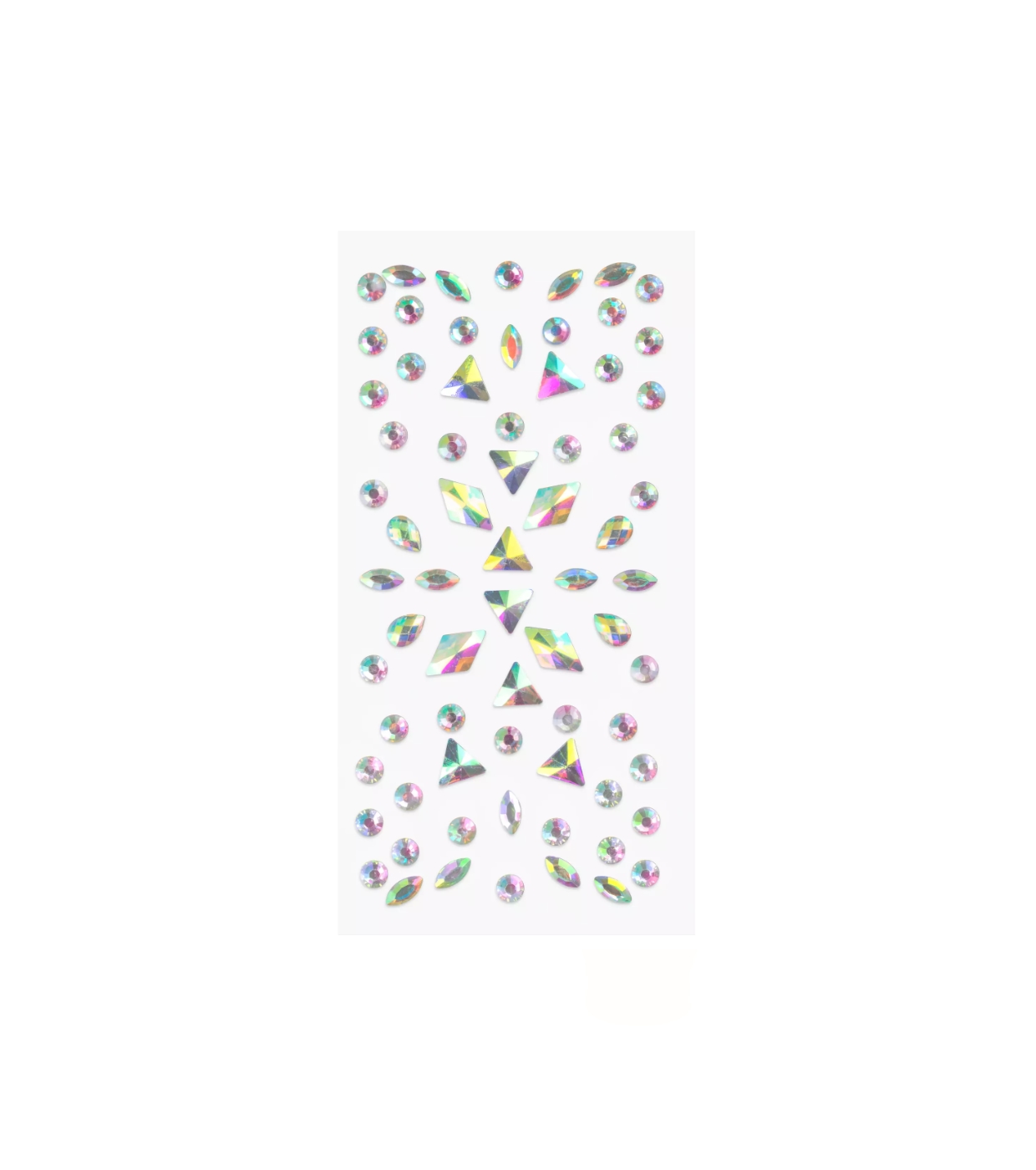 Ce superbe ensemble comprend 65 pierres auto-adhésives de tailles et de formes différentes, chacune dotée d'une finition irisée et holographique qui reflète la lumière de façon spectaculaire.