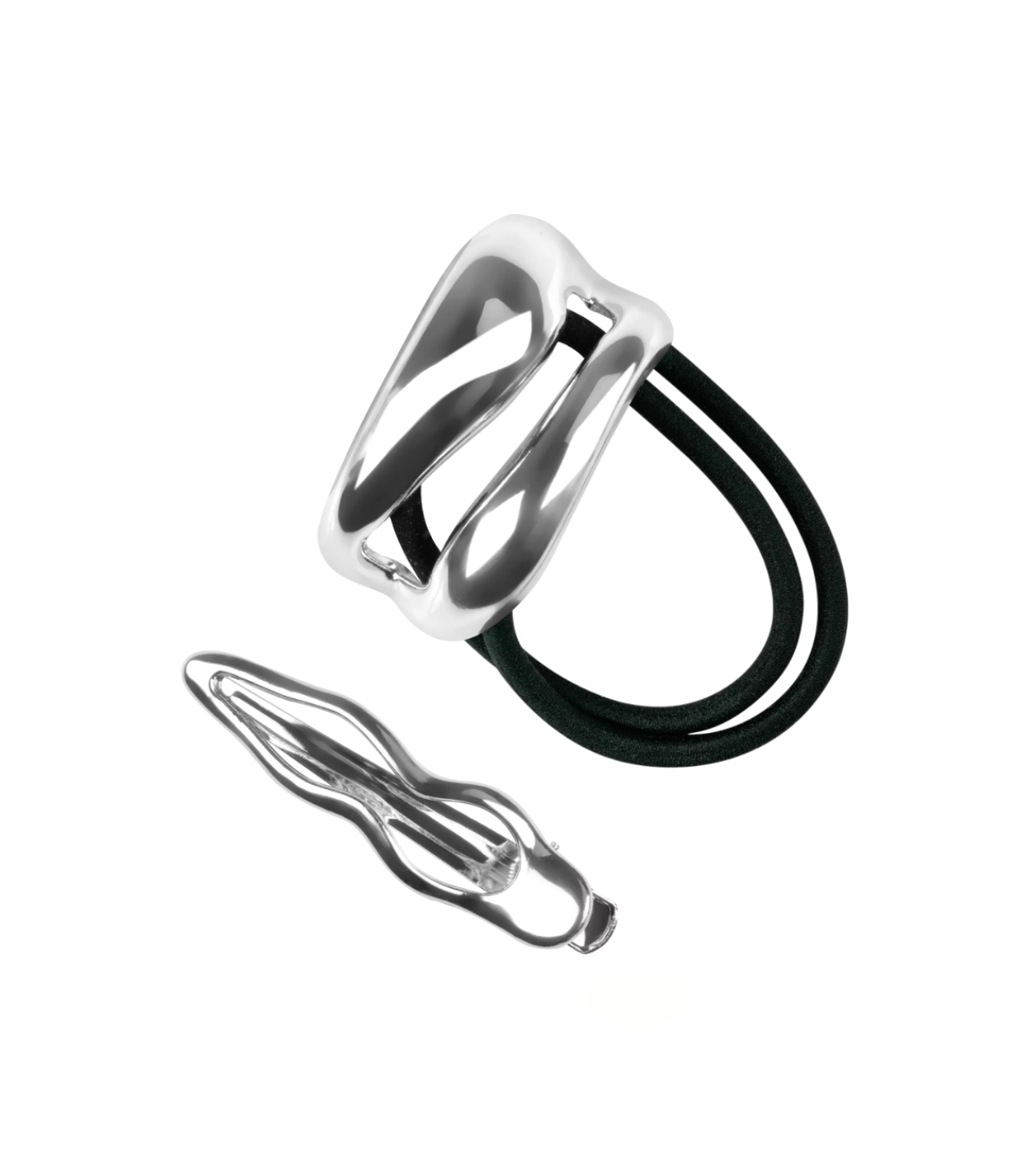L'ensemble comprend 2 pièces au design sculptural et chromé, idéales pour personnaliser rapidement et facilement les queues de cheval, les tresses ou les mèches lâches.
