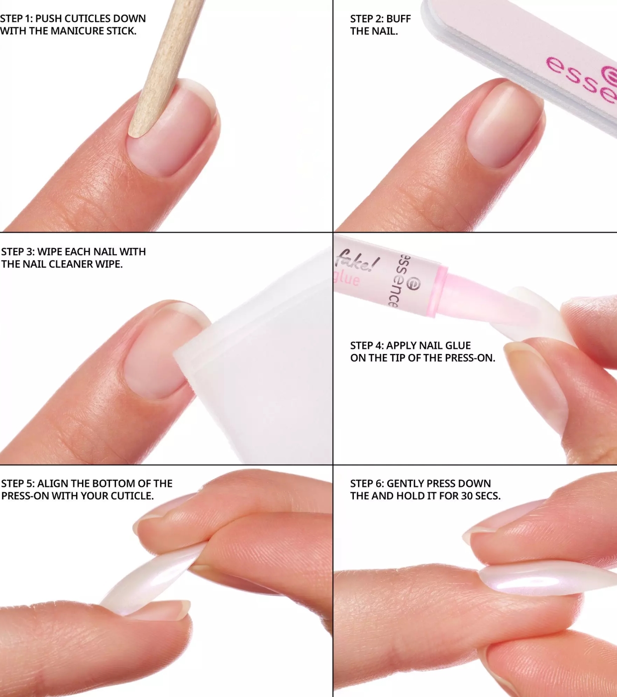 L'ensemble comprend également de la colle à ongles, un bâton de manucure, une mini lime à ongles et une lingette nettoyante pour les ongles : tous les éléments essentiels pour une manucure lisse et durable.