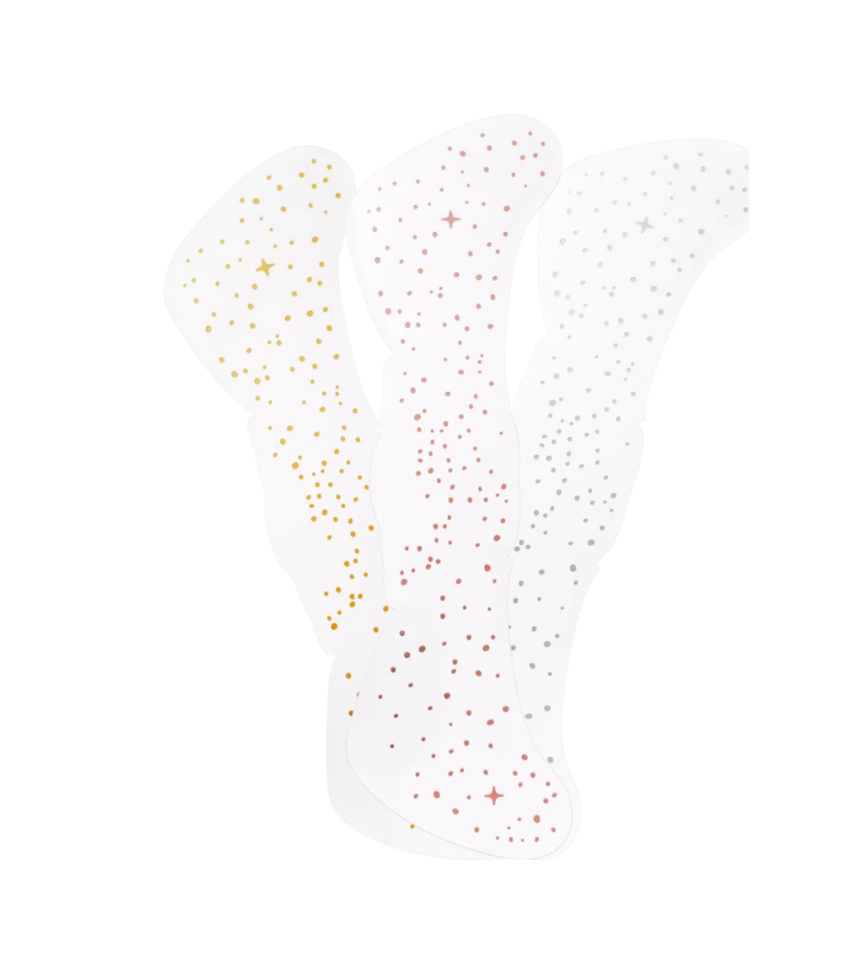 Ce kit comprend trois planches de tatouages temporaires dans les tons or rose, or et argent, conçues pour offrir un éclat ludique et lumineux en quelques secondes seulement.