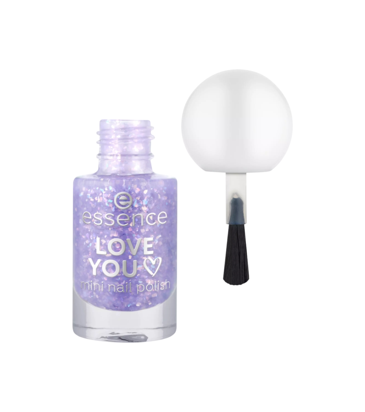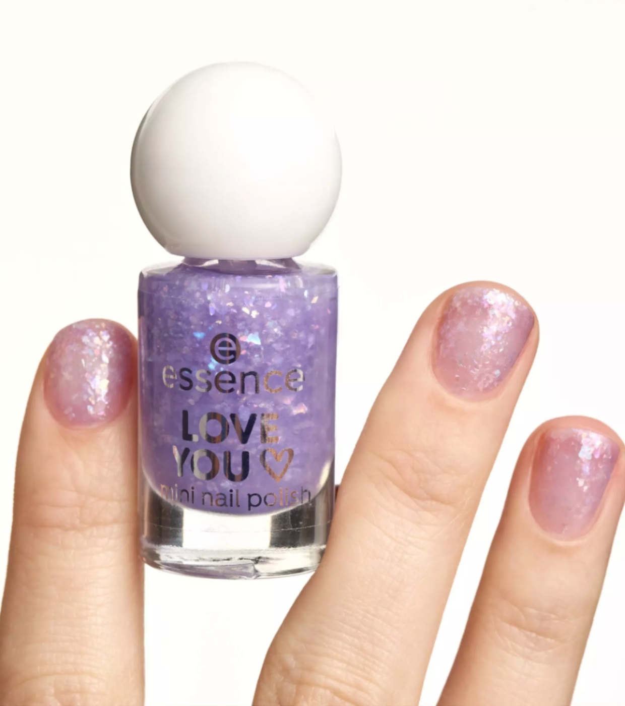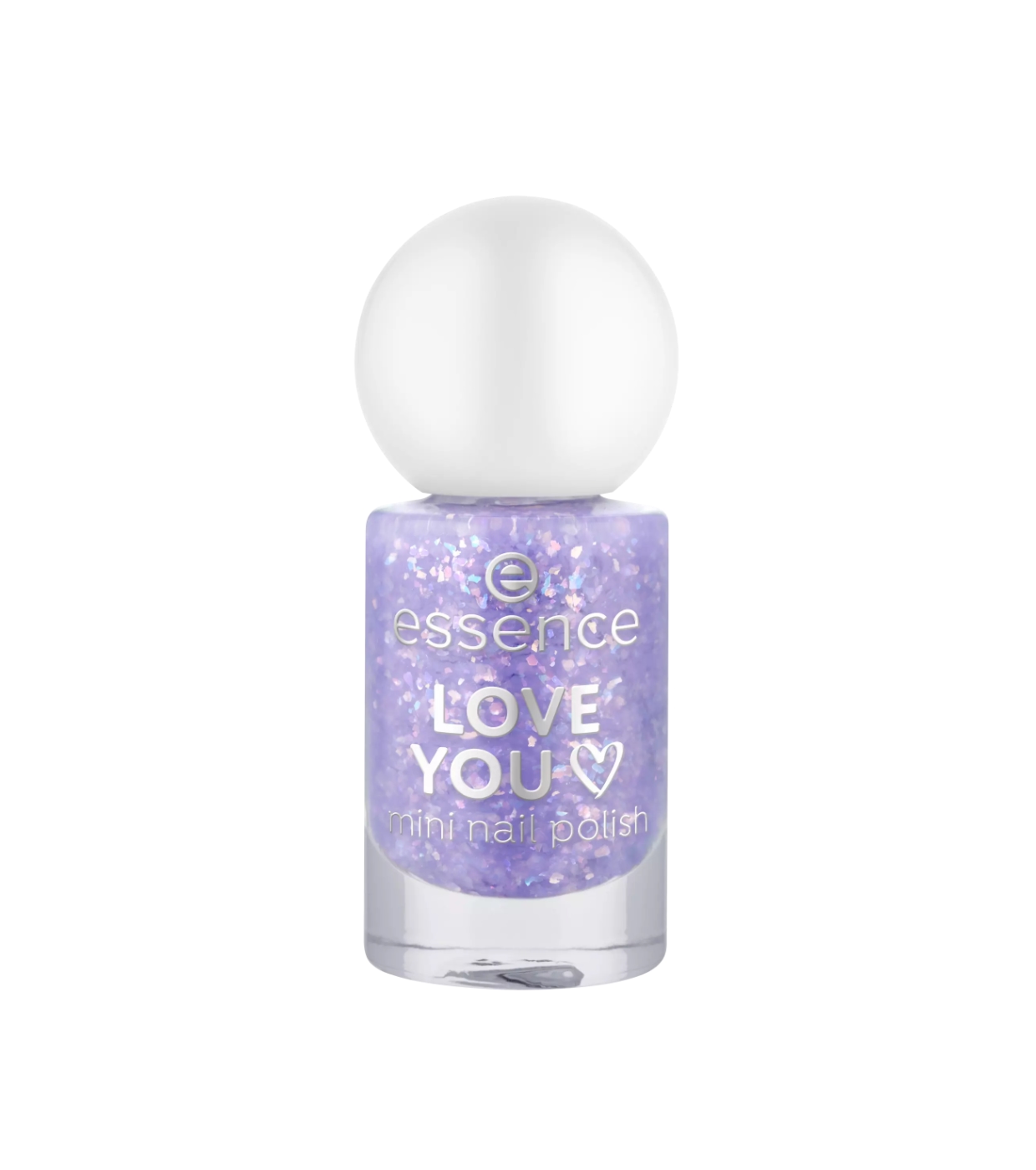 Le mini vernis à ongles Love You 13 de essence a une teinte lilas avec des particules de confettis holographiques qui créent une brillance multidimensionnelle spectaculaire.