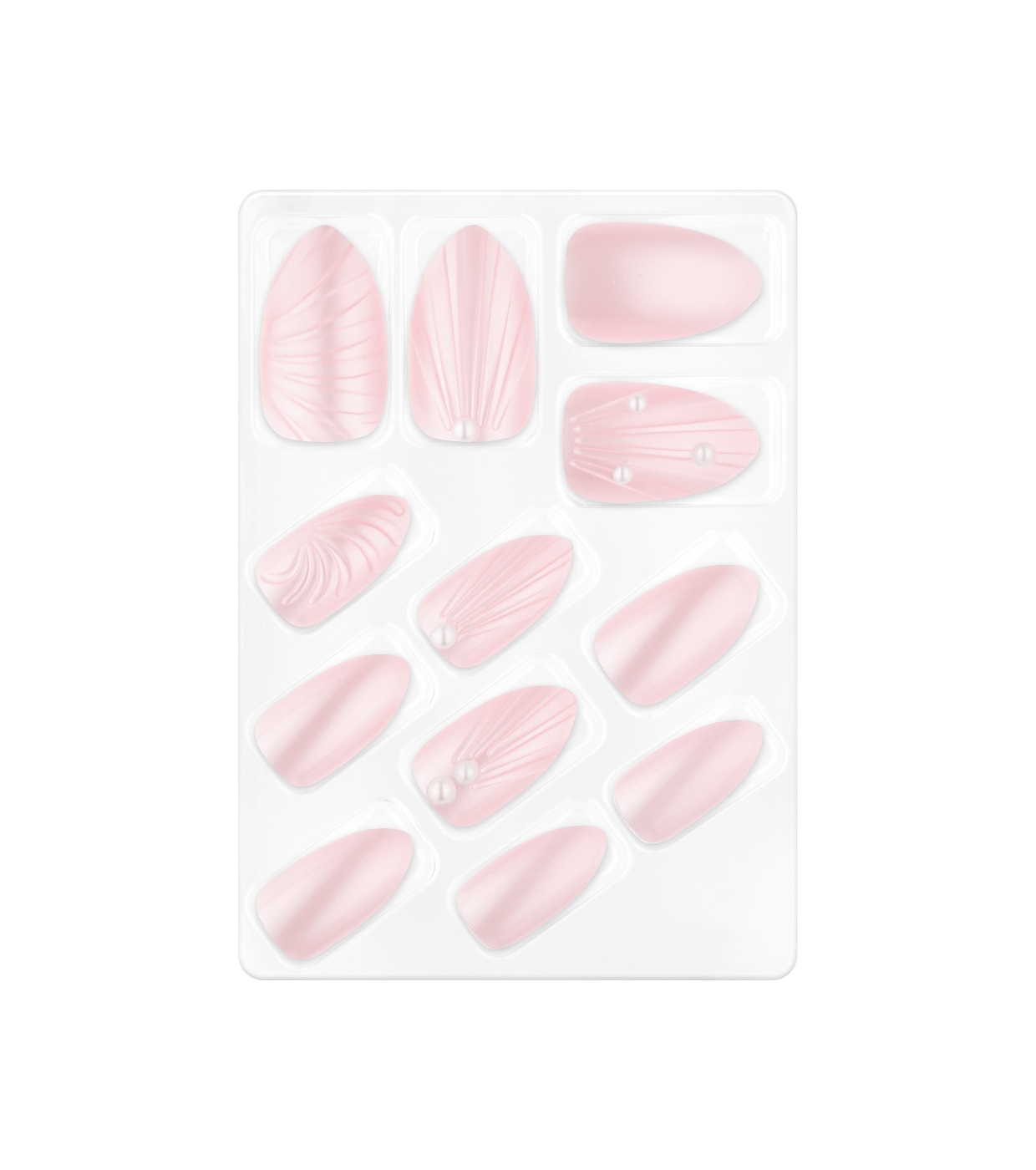 Ce kit comprend 12 faux ongles à coller, conçus dans de délicates nuances de rose avec des reliefs inspirés des coquillages et de petits détails nacrés qui ajoutent une touche élégante et magique.