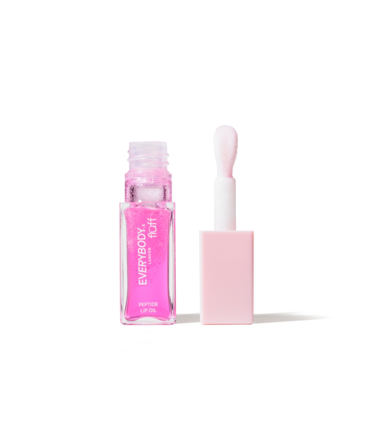 Découvrez l' huile à lèvres peptidique issue de la collaboration Everybody London x Fluff , présentée dans un magnifique flacon transparent au design rose.