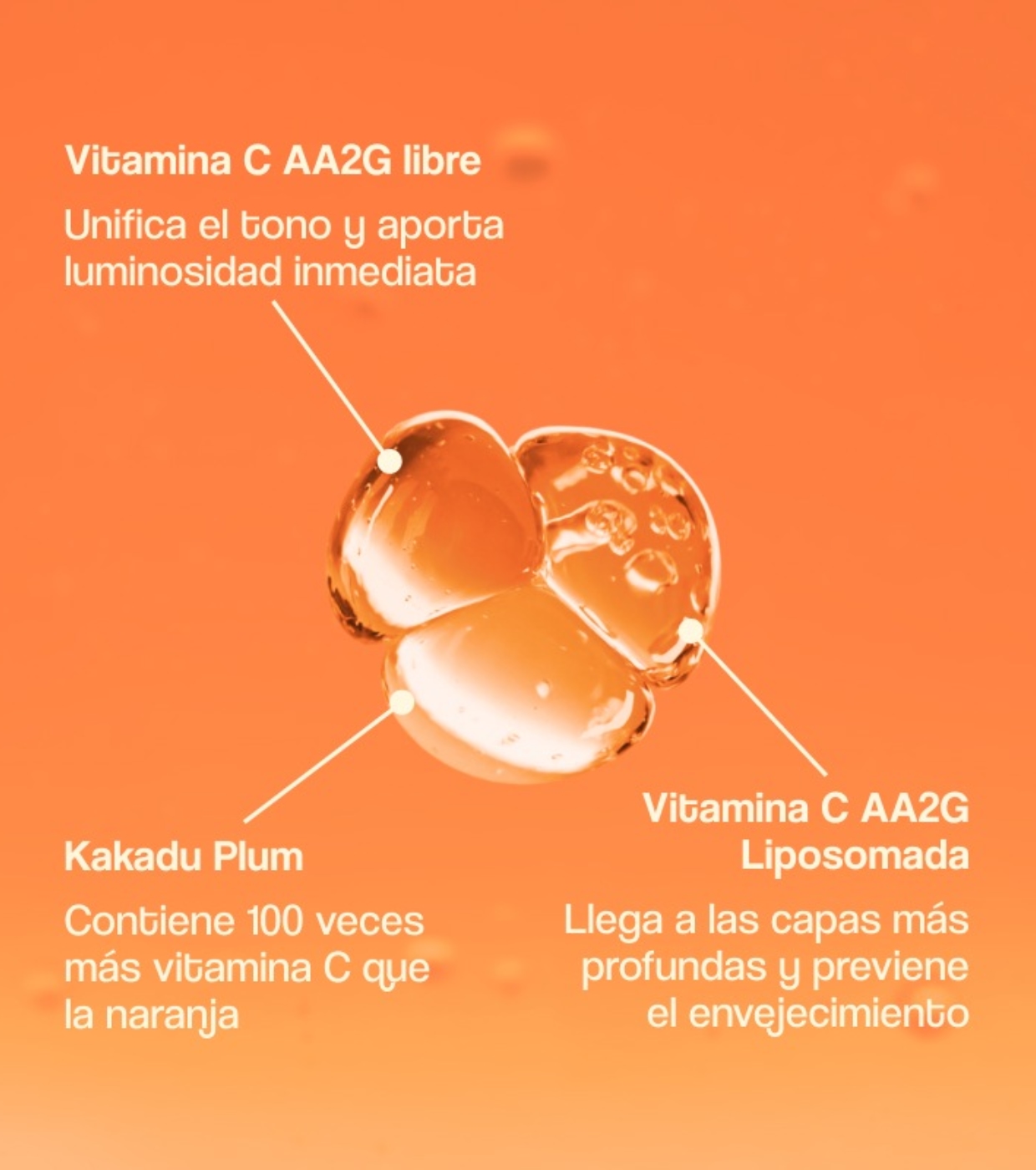 Sa formule associe de la vitamine C liposomale AA2G (5%), de la vitamine C libre AA2G (5%) et de la prune de Kakadu, un ingrédient actif naturel contenant jusqu'à 100 fois plus de vitamine C que les oranges, pour une efficacité raffermissante et lumineuse intensifiée et des résultats visibles dès la première utilisation.