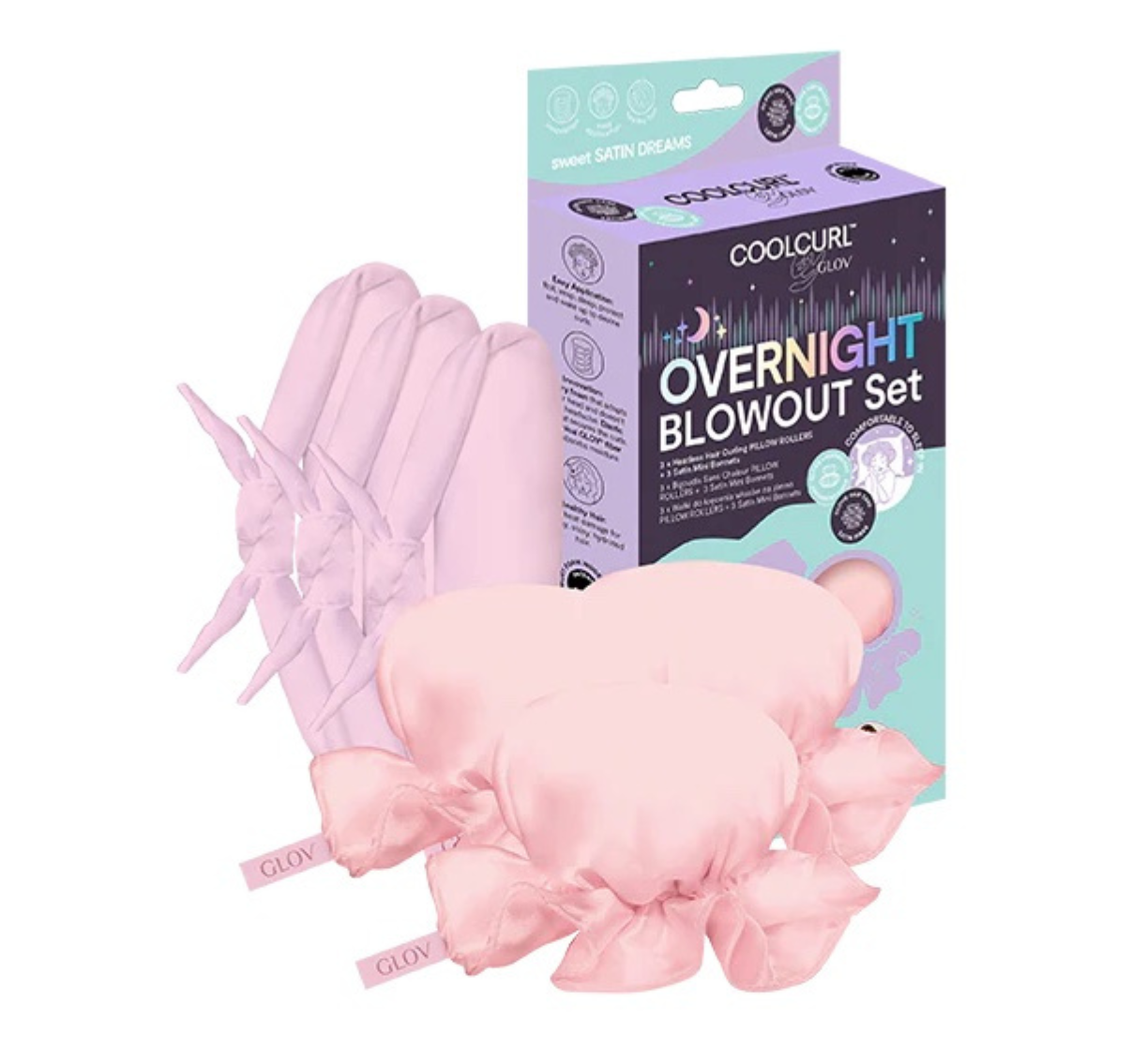 Ensemble de mini bonnets en satin GLOV Overnight Blowout + rouleaux à friser sans chaleur.