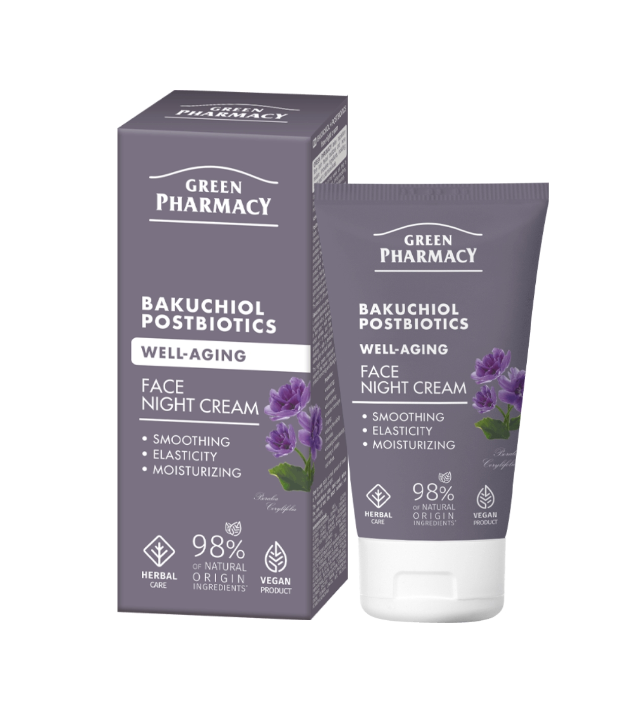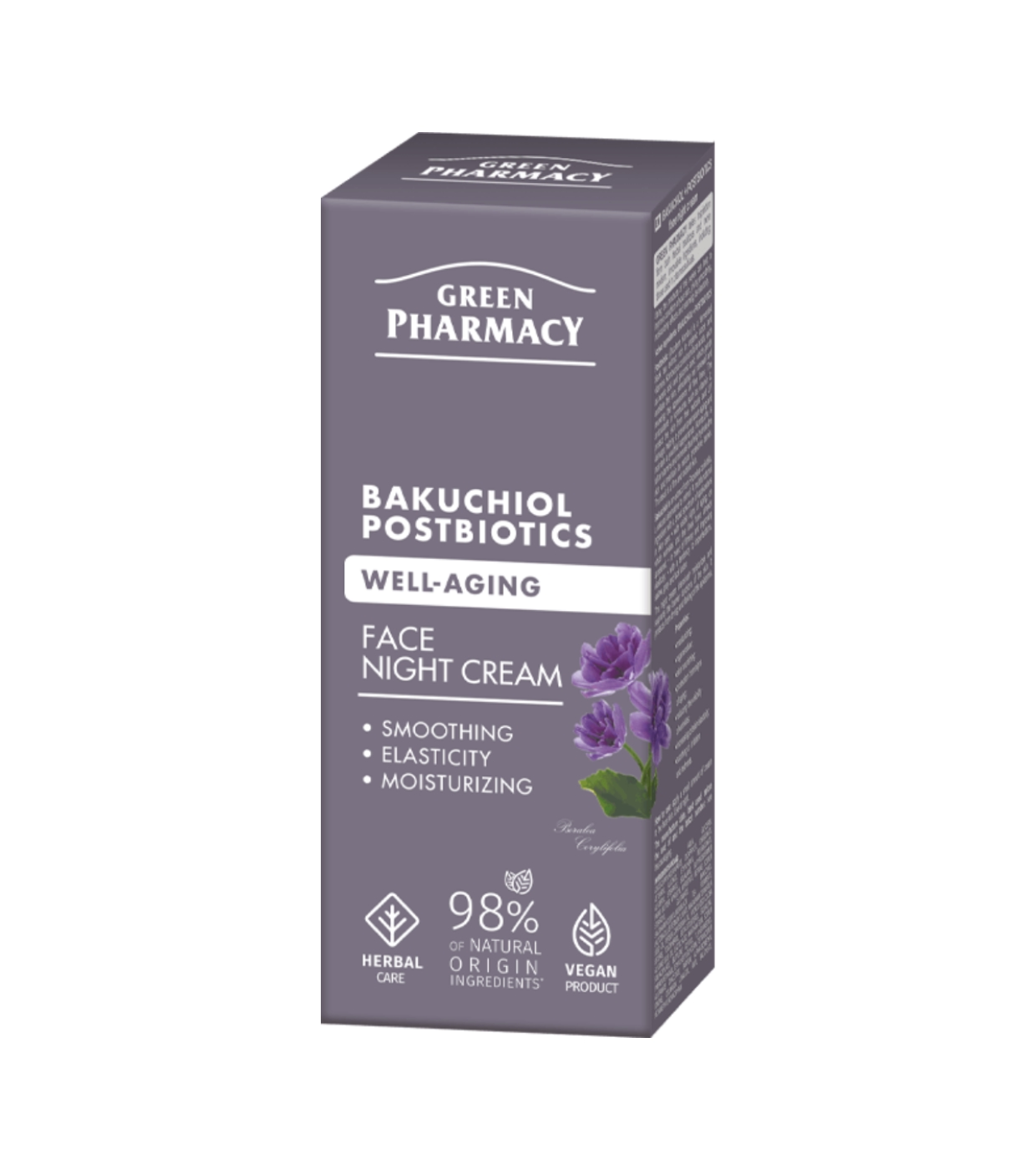 Green Pharmacy La Crème Visage de Nuit Anti-Âge au Backuchiol et Postbiotiques a été conçue pour apporter une hydratation en profondeur et renforcer la barrière protectrice de la peau pendant la nuit.