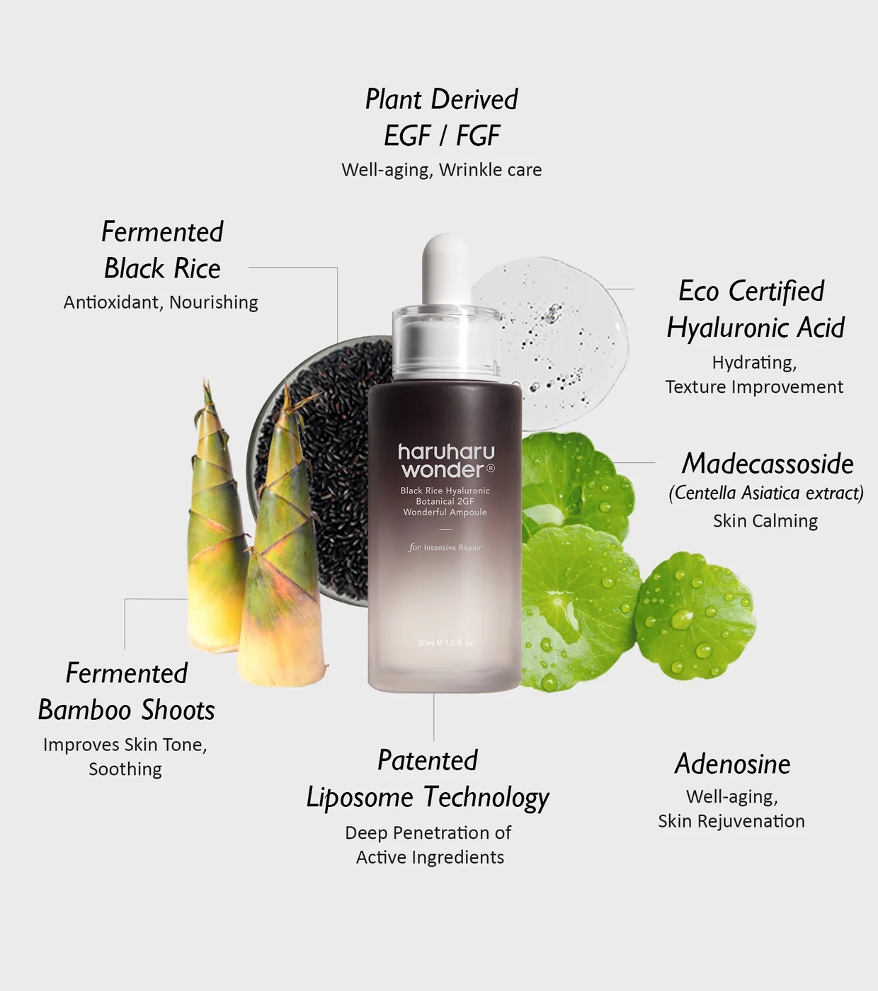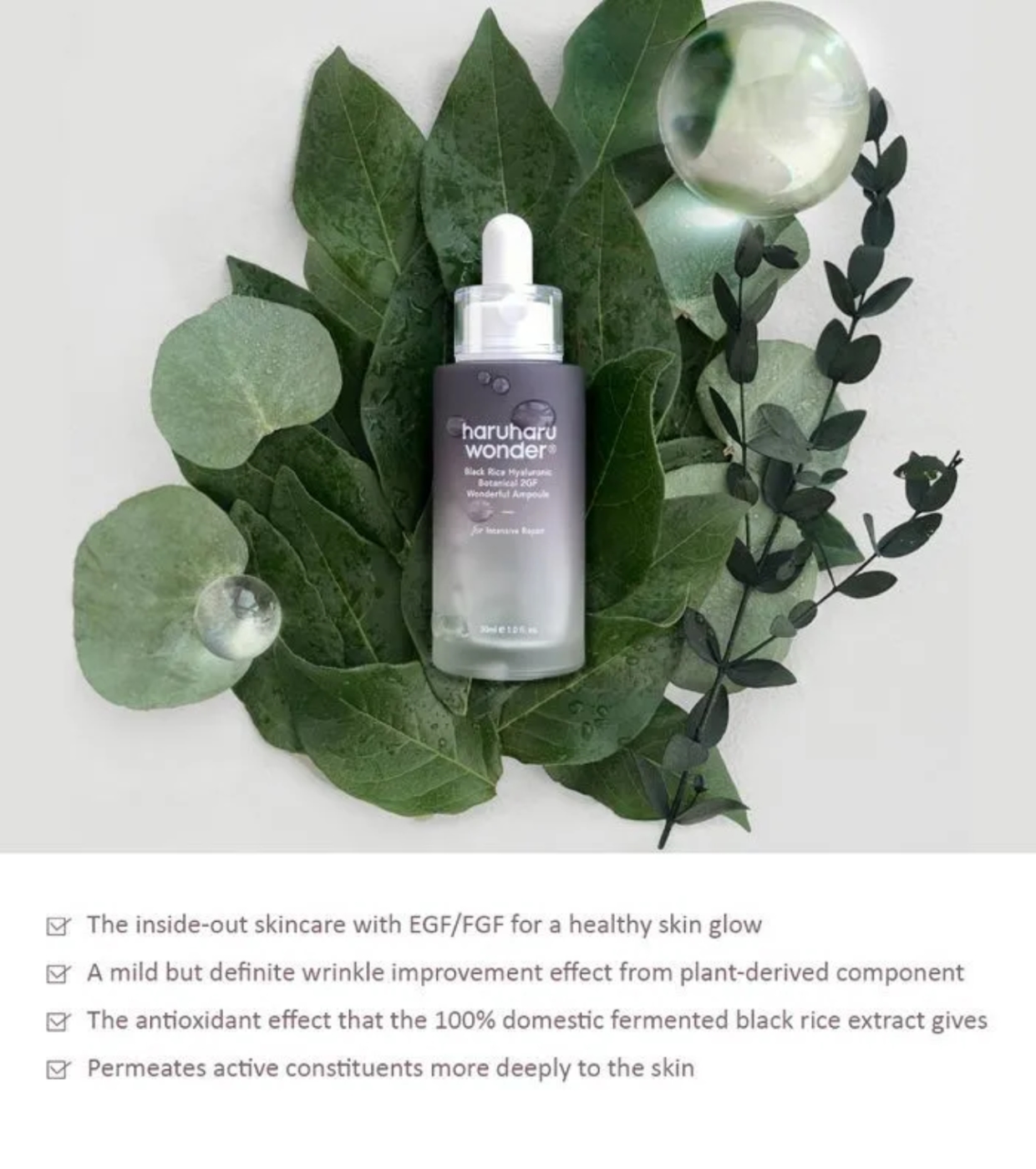 Revitalisez votre peau avec l'ampoule Black Rice Hyaluronic Botanical 2GF de Haruharu Wonder , un sérum anti-âge concentré formulé avec 95% d'ingrédients d'origine naturelle.