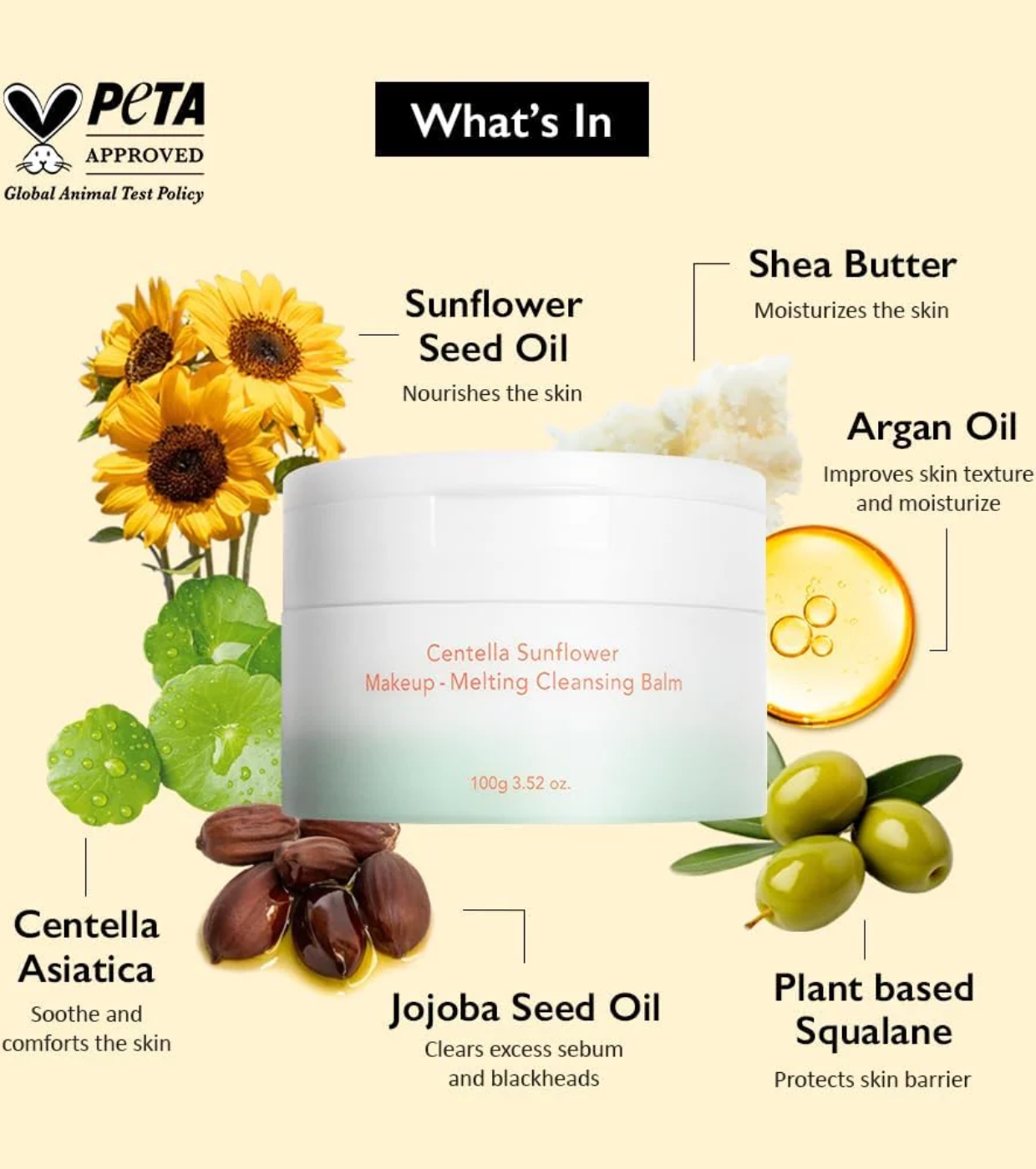 Cetyl Ethylhexanoate, PEG-20 Glyceryl Triisostearate, Synthetic Wax, Helianthus Annuus (Sunflower) Seed Oil Unsaponifiables(5,000ppm), Argania Spinosa Kernel Oil, Butyrospermum Parkii (Shea) Butter, Simmondsia Chinensis (Jojoba) Seed Oil, Squalane, Olea Europaea (Olive) Fruit Oil, 1,2-Hexanediol, Water, Panthenol, Butylene Glycol, Propanediol, Centella Asiatica Extract(0.01ppm), Melaleuca Alternifolia (Tea Tree) Flower/Leaf/Stem Extract, Calendula Officinalis Flower Extract, Ethylhexylglycerin
