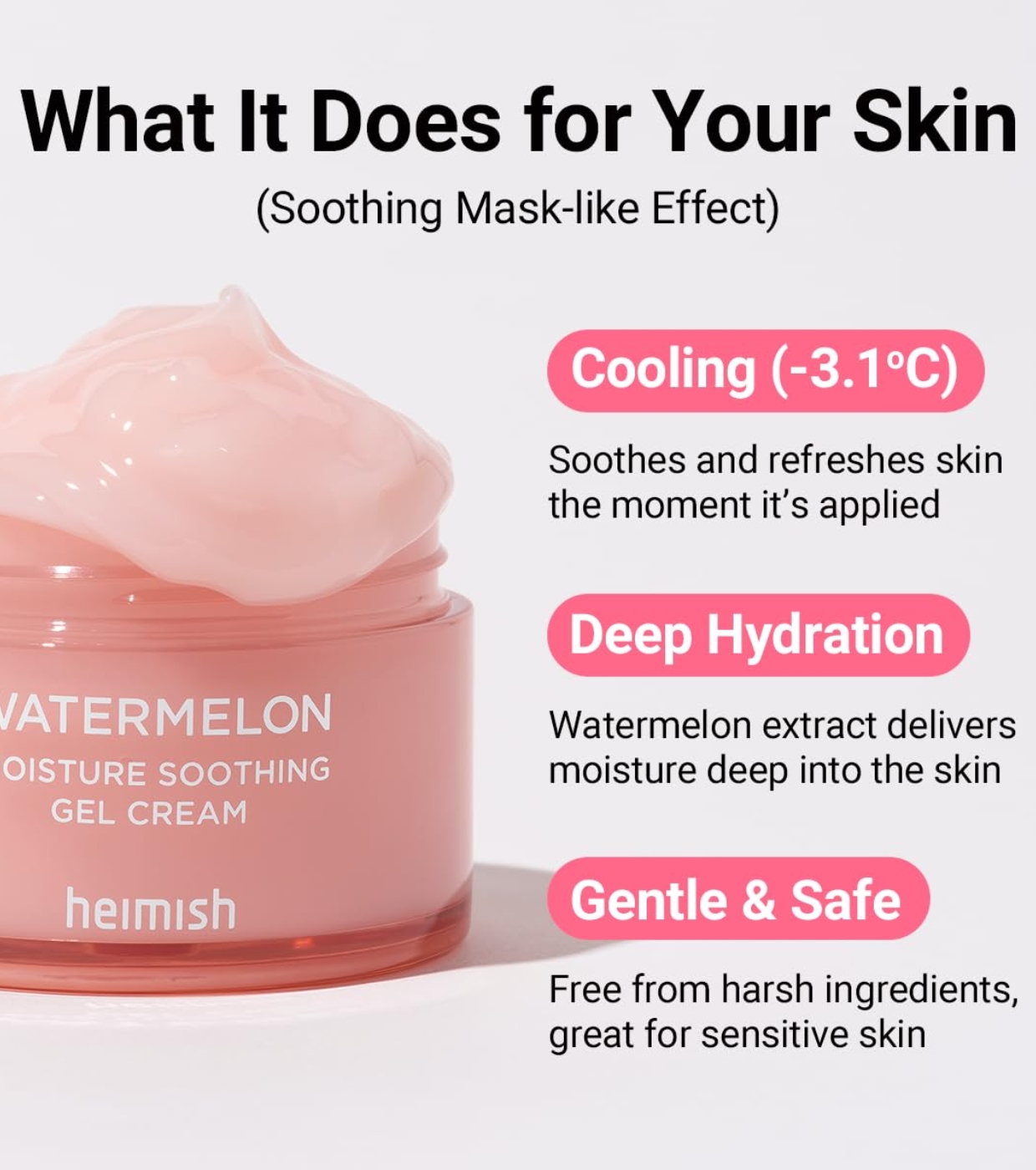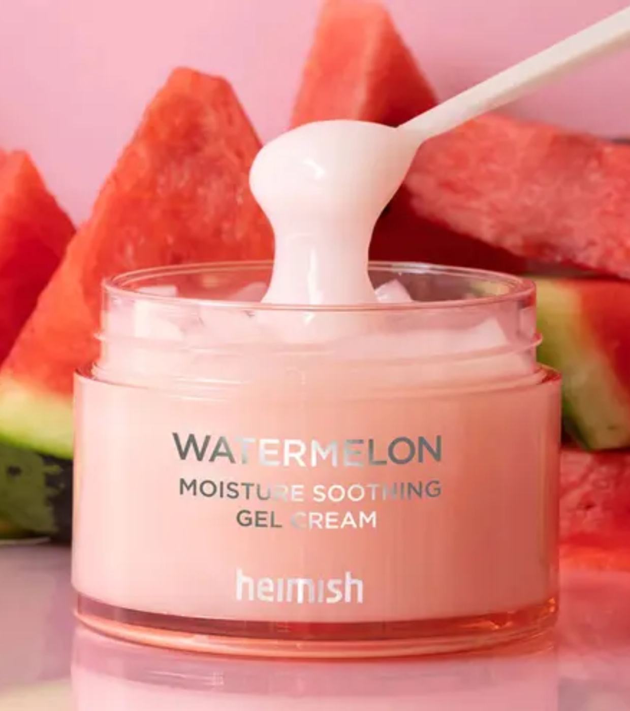 La Heimish Watermelon Moisture Soothing Gel Cream est une crème hydratante pour le visage à la texture gel-crème qui offre un effet calmant immédiat et aide à réduire la température de la peau, soulageant les rougeurs et la sensibilité.