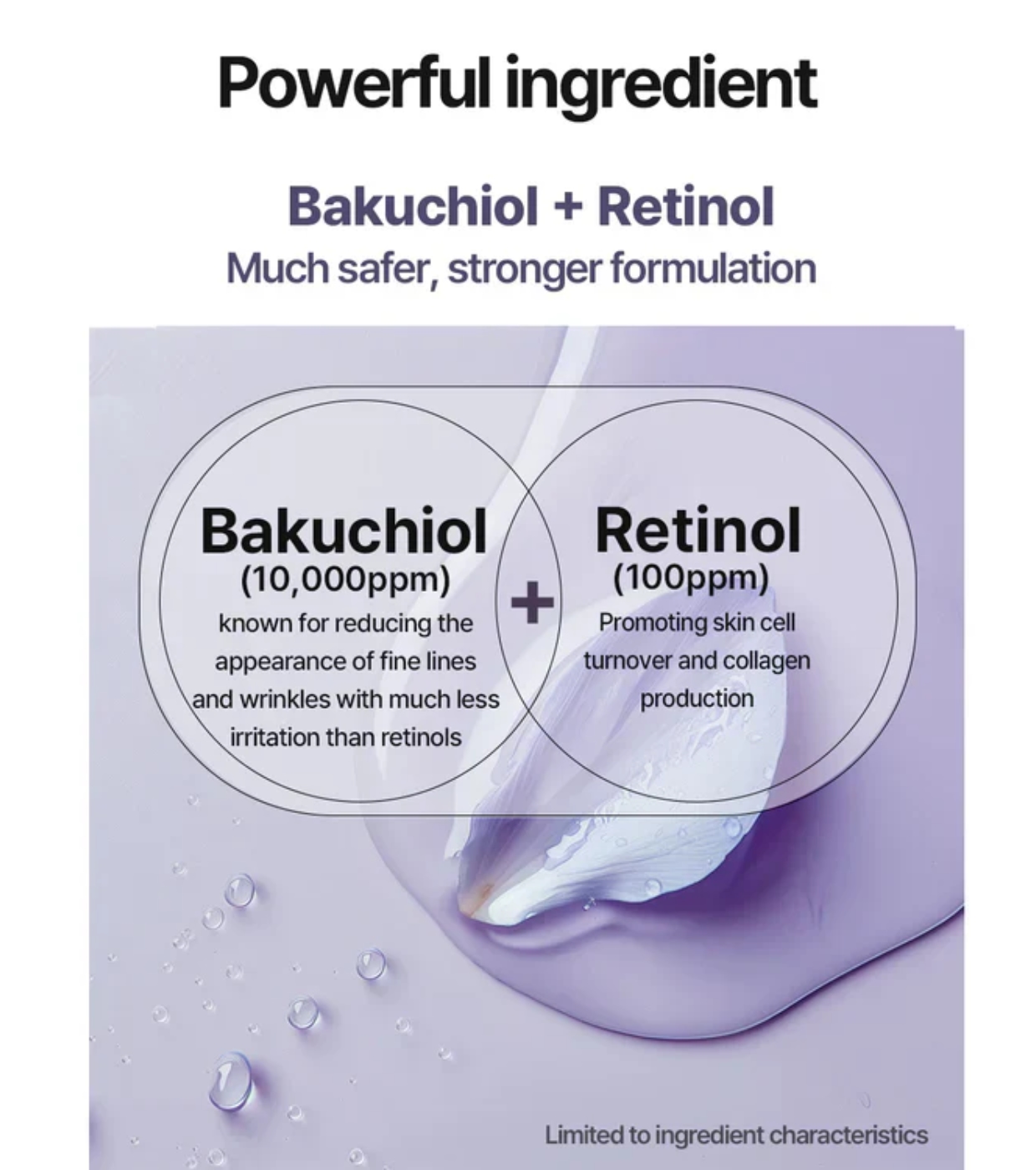 Sa combinaison innovante de 1 % de bakuchiol (une alternative végétale au rétinol) et de 0,01 % de rétinol offre un traitement efficace mais doux qui aide à réduire les rides, les ridules et les poches.