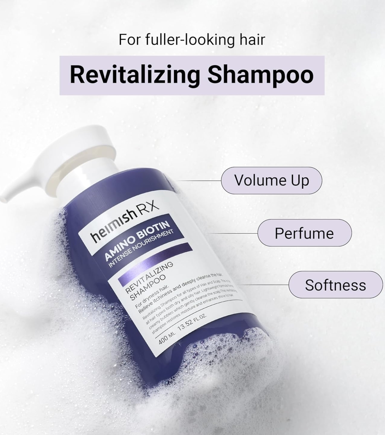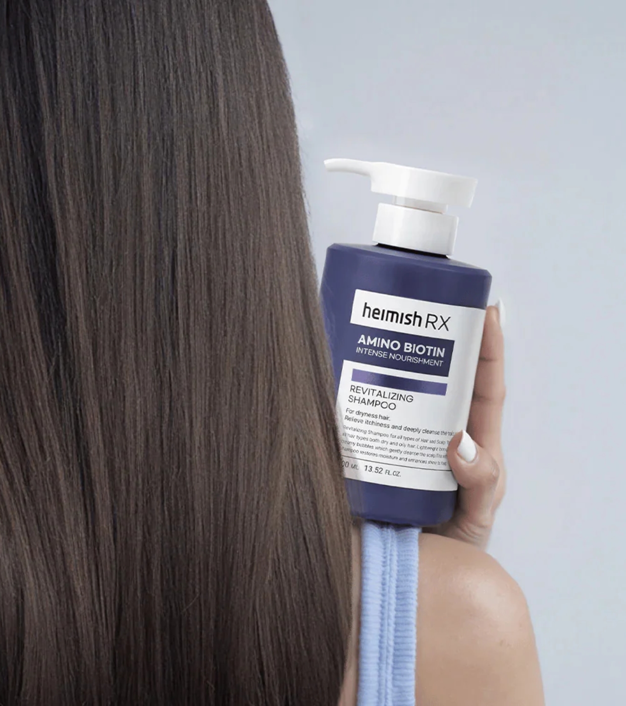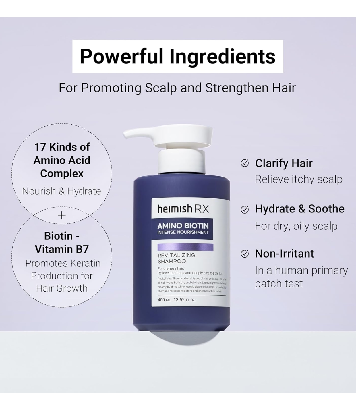 Le Heimish RX Amino Biotin Revitalizing Shampoo est un shampooing revitalisant et nourrissant formulé avec de la biotine, 17 acides aminés et des peptides qui agissent en synergie pour renforcer les cheveux, stimuler une croissance saine et apporter une brillance naturelle.