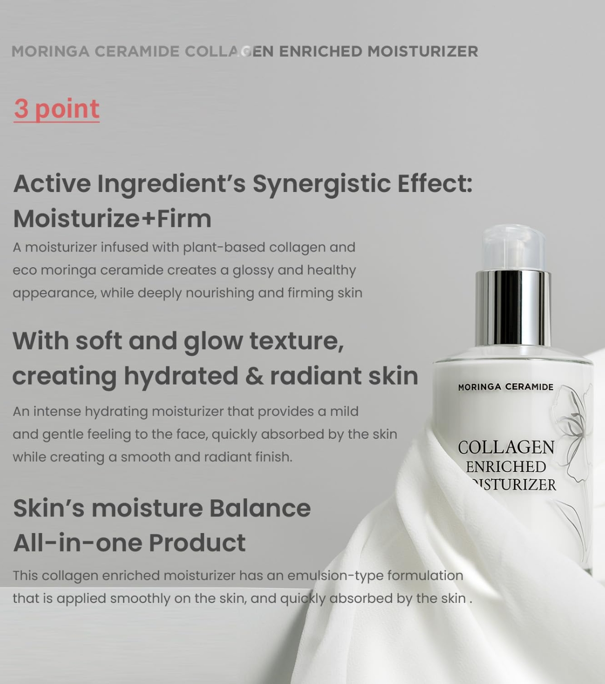 Water, Mineral Oil, Butylene Glycol, Triethanolamine, Cetearyl Alcohol, 1,2-Hexanediol, Stearic Acid, Palmitic Acid, Moringa Oleifera Seed Oil(3,920ppm), Carbomer, Glyceryl Stearate, PEG-100 Stearate, Illicium Verum (Anise) Fruit Extract, Glycerin, Octyldodecanol, Oleyl Alcohol, Scutellaria Baicalensis Root Extract, Butyrospermum Parkii (Shea) Butter, Hydrolyzed Soy Flour, Collagen Extract(98ppm), Ceramide NP(40ppm), Phytosphingosine, Hydrogenated Lecithin, Glycine Soja (Soybean) Sterols,Candida Bombicola/Glucose/Methyl Rapeseedate Ferment, Tocopherol, Beta-Glucan, Centella Asiatica Extract, Fragrance