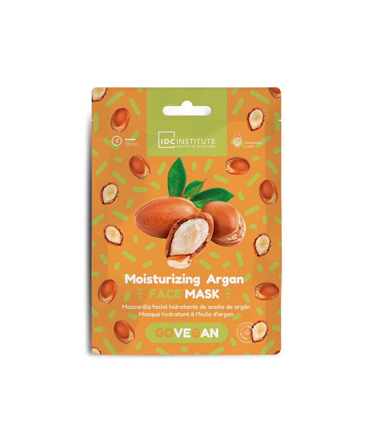 Ce masque facial en tissu IDC Institute est infusé d'huile essentielle d'argan, connue pour ses propriétés hydratantes et rajeunissantes.