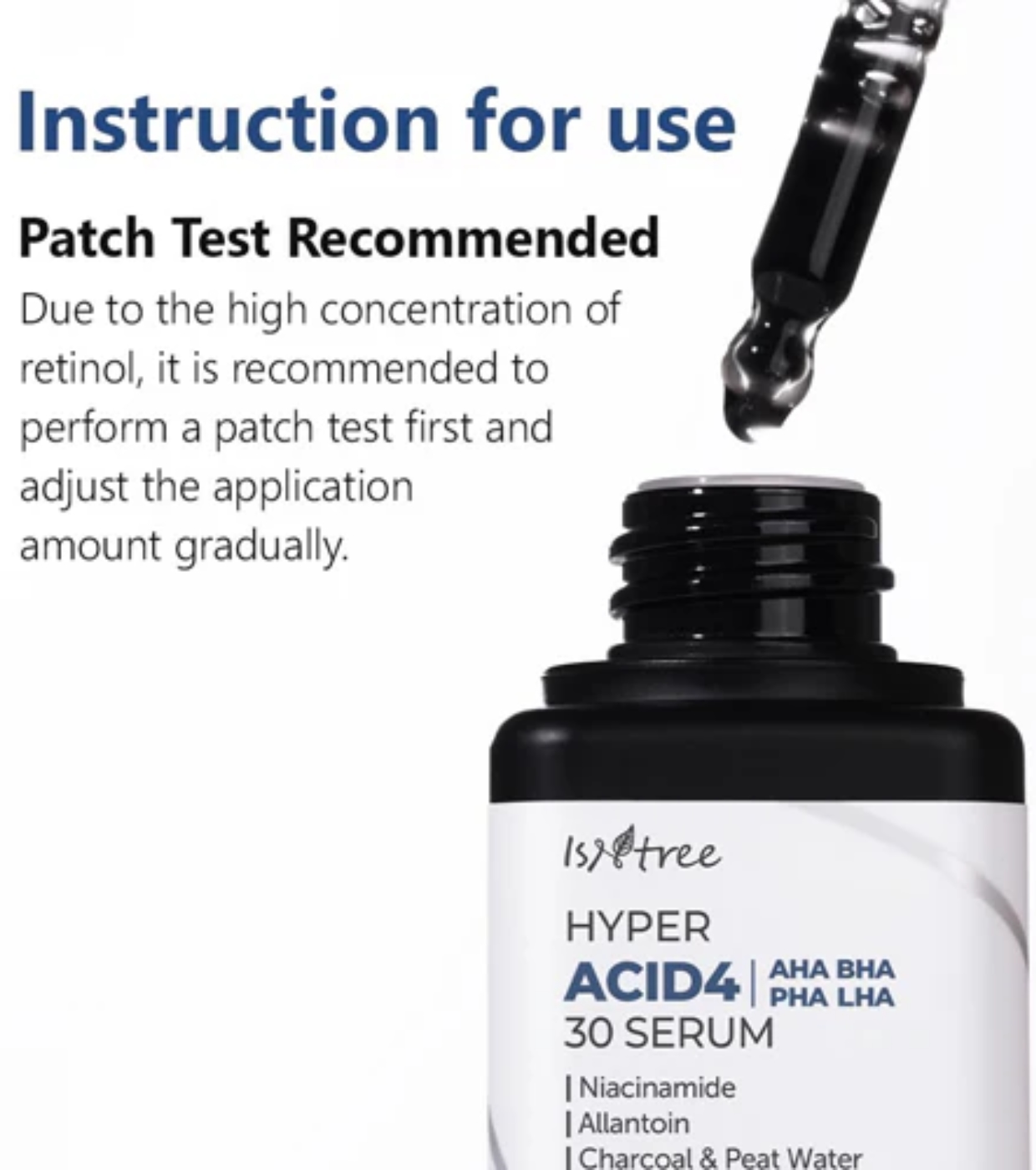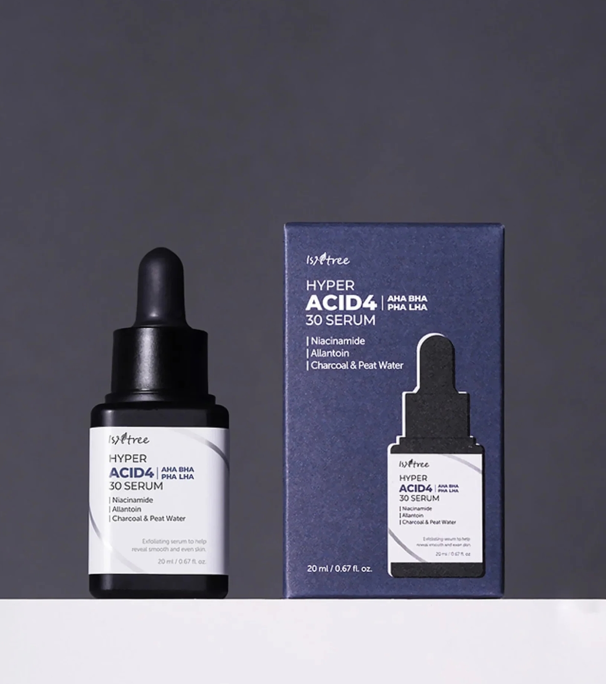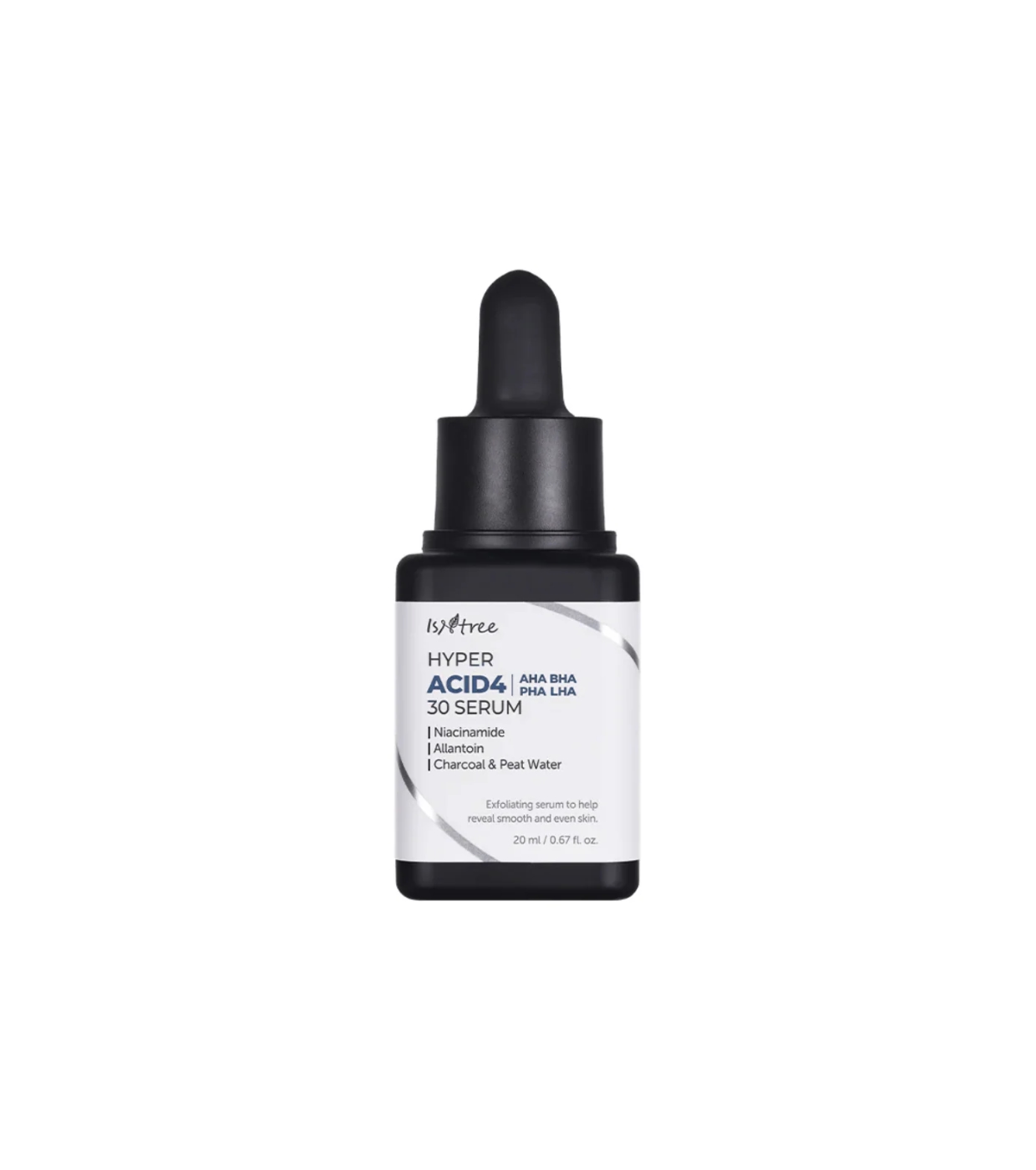 Le Isntree Hyper Acid 4 AHA BHA PHA LHA 30 Serum est un traitement exfoliant avancé formulé avec une concentration de 30 % d'ACID 4, qui combine AHA (15,3 %), BHA (0,1 %), PHA (14,61 %) et LHA (0,01 %).