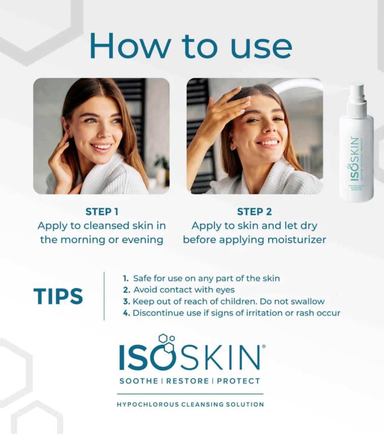 Soin quotidien : Vaporiser généreusement sur le visage et le corps deux fois par jour ou selon les besoins. Laisser sécher à l’air libre ou en tapotant.
