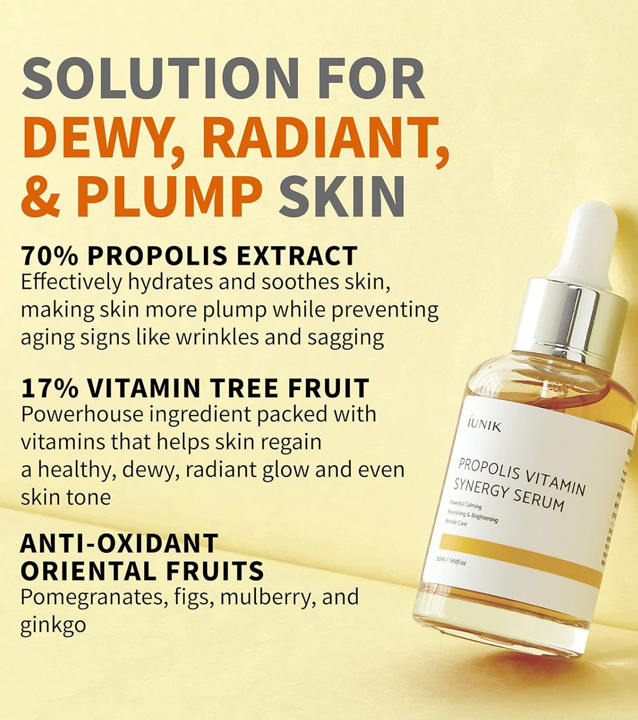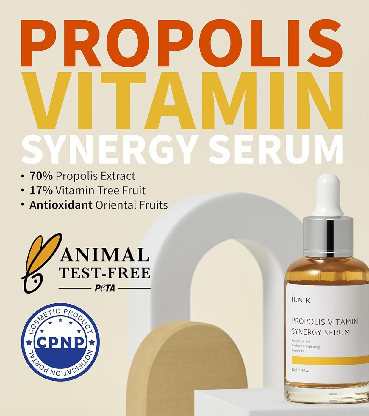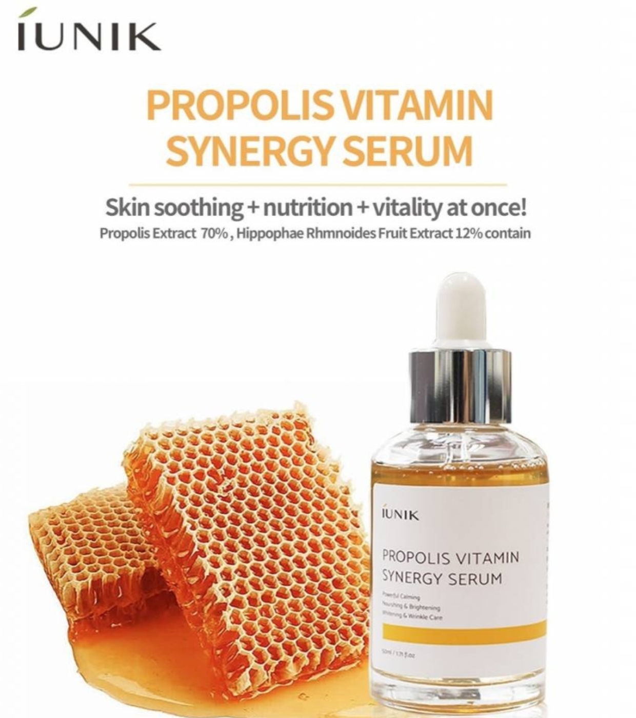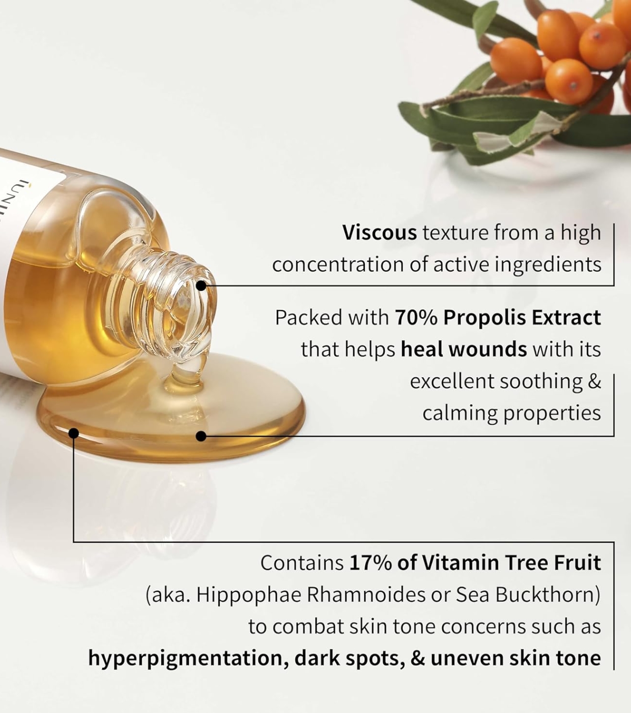 iUNIK Propolis Vitamin Synergy Serum est un sérum nourrissant et apaisant formulé avec 70 % d'extrait de propolis et 12 % d'extrait d'argousier (Hippophae Rhamnoides).