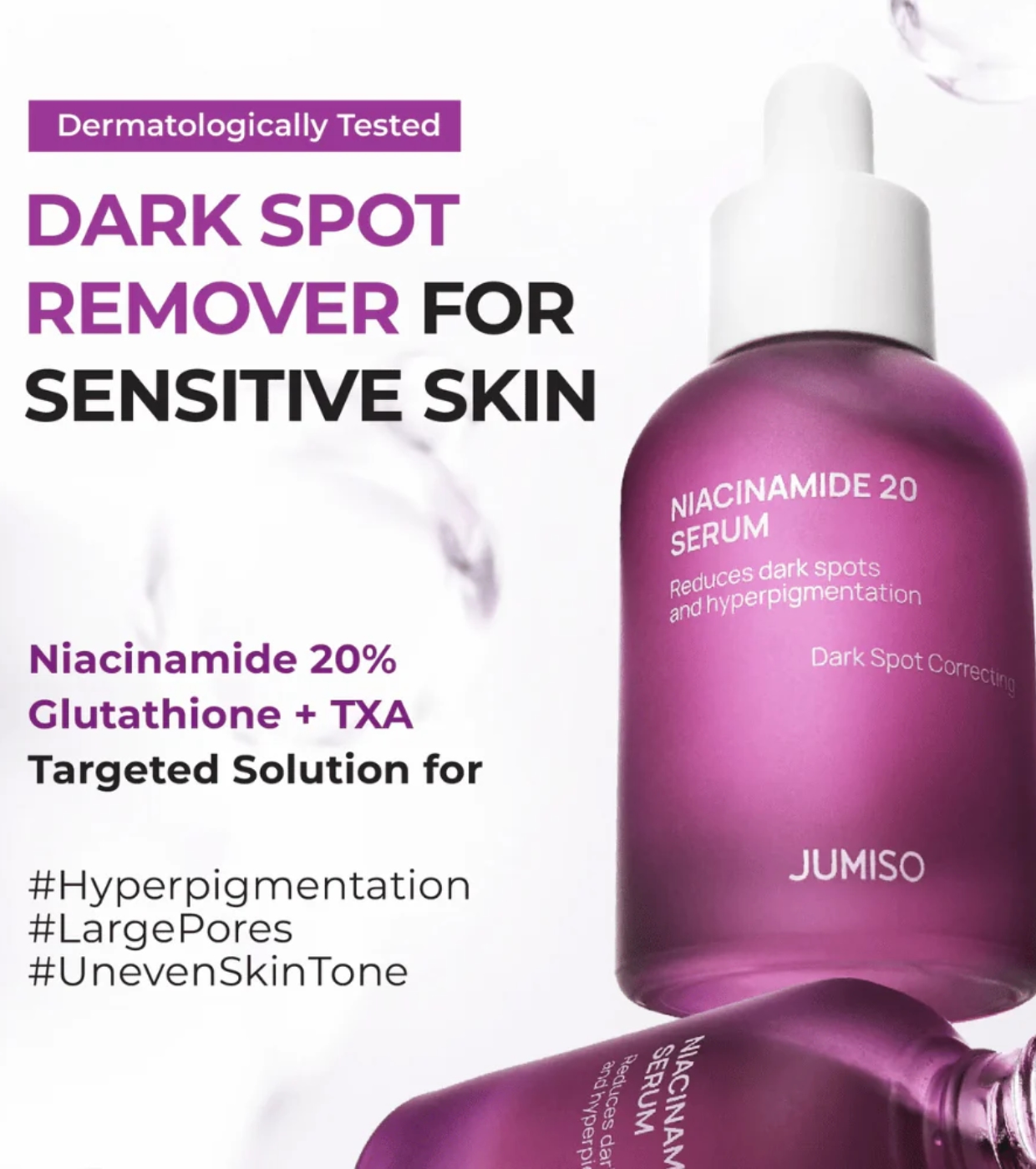 Ce sérum éclaircissant Niacinamide 20 de Jumiso combine 20 % de niacinamide, du glutathion et de l'acide tranexamique (TXA) pour aider à obtenir un teint plus clair, plus uniforme et plus éclatant en seulement 2 semaines d'utilisation quotidienne régulière.