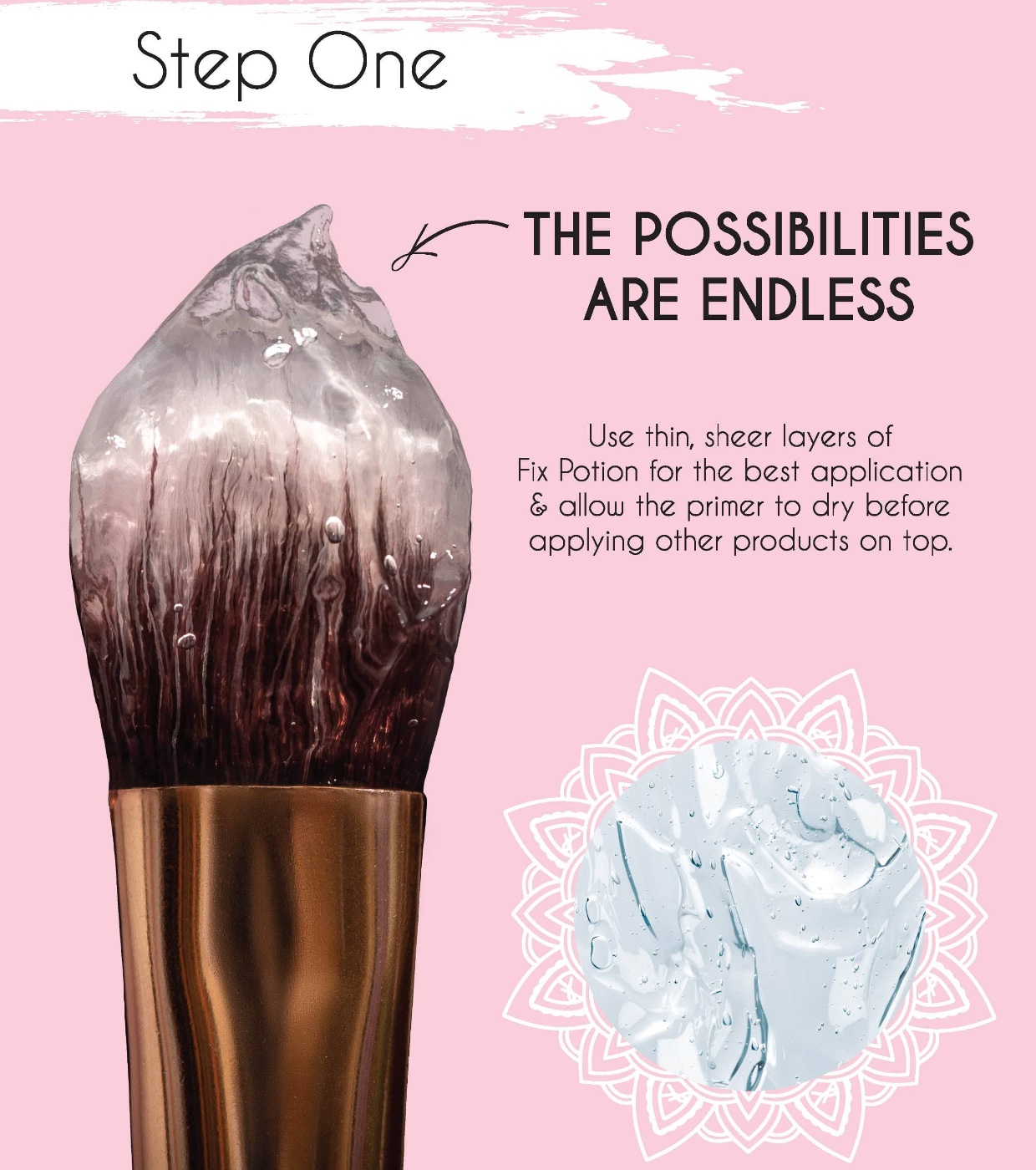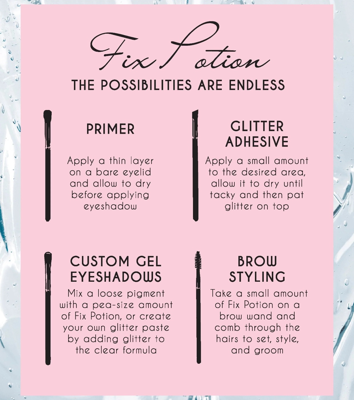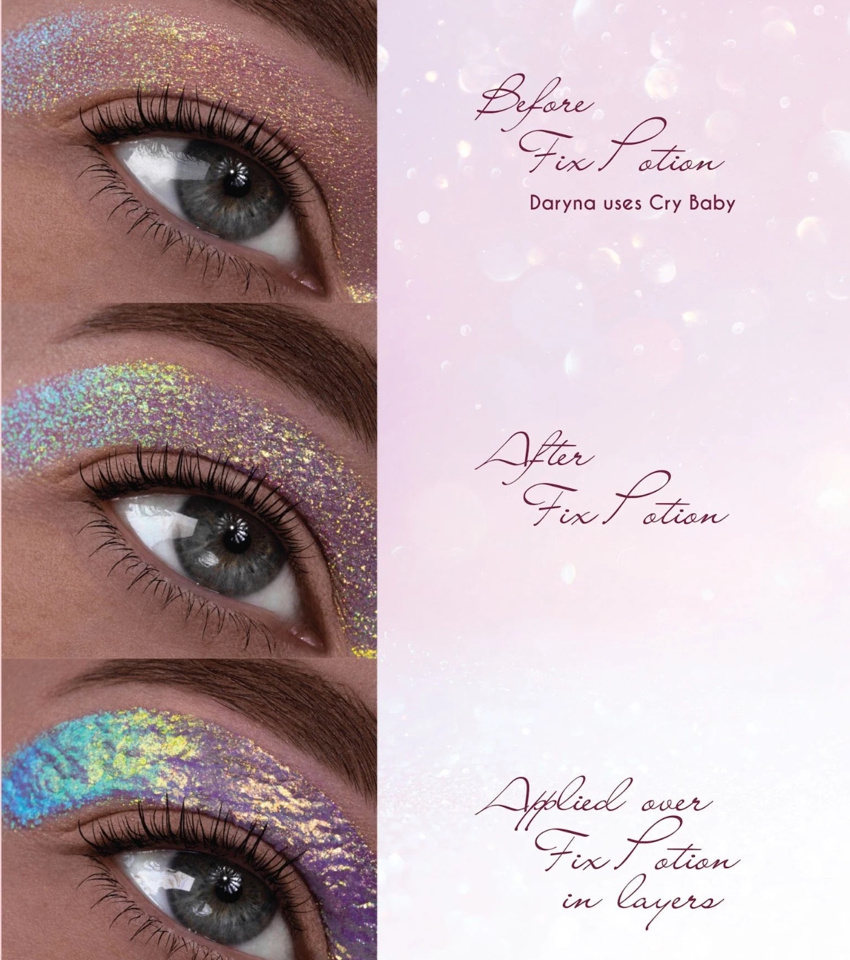 - Personnalisez vos propres fards à paupières en mélangeant un pigment libre avec une quantité de Fix Potion de la taille d'un pois, ou créez votre propre pâte scintillante en ajoutant des paillettes à la formule transparente.