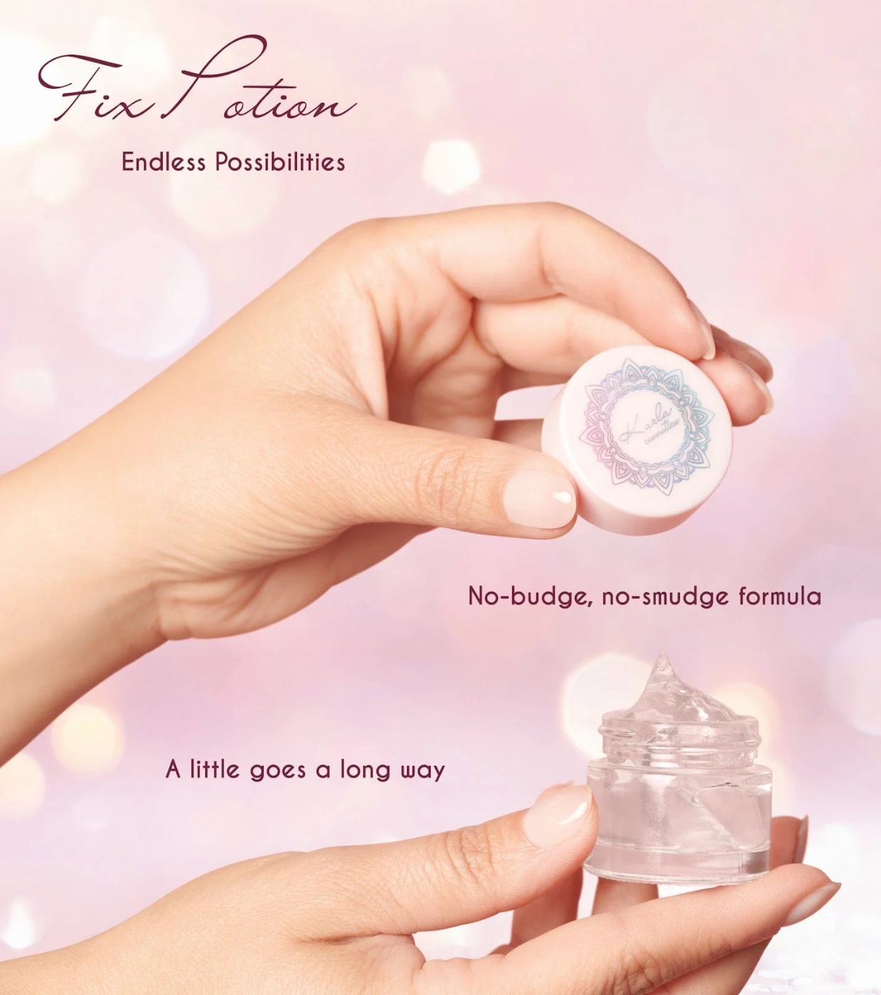 Fix Potion, est une base en gel clair, soyeux et cristallin, avec une finition semi-mate qui garantit que votre brillance, vos pigments et vos ombres à paupières restent parfaitement pendant des heures.