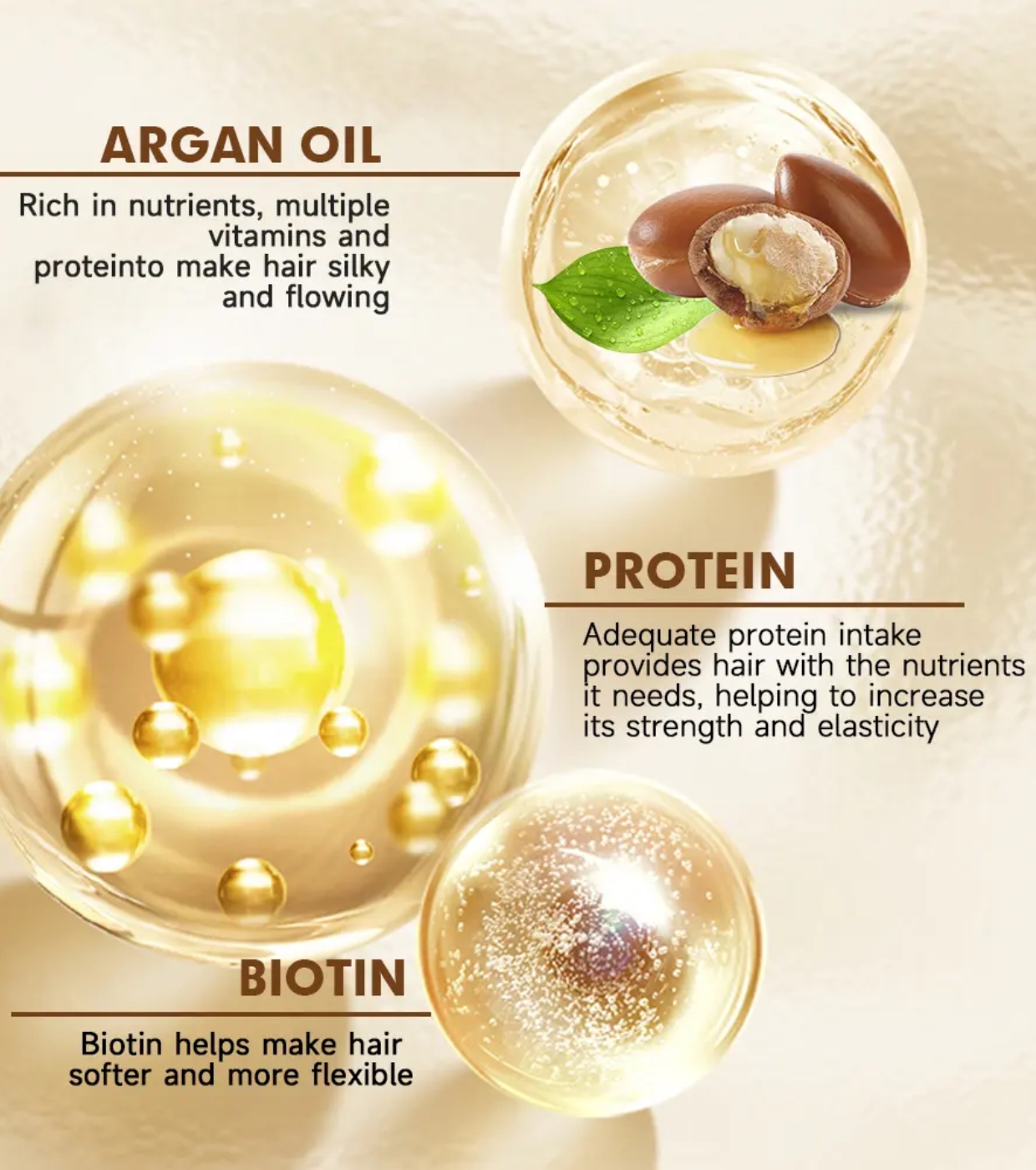 Grâce à sa combinaison d'huile d'argan, de kératine et d'huiles naturelles, il répare les fibres capillaires de l'intérieur, contrôle les frisottis et apporte une brillance intense sans alourdir les cheveux.