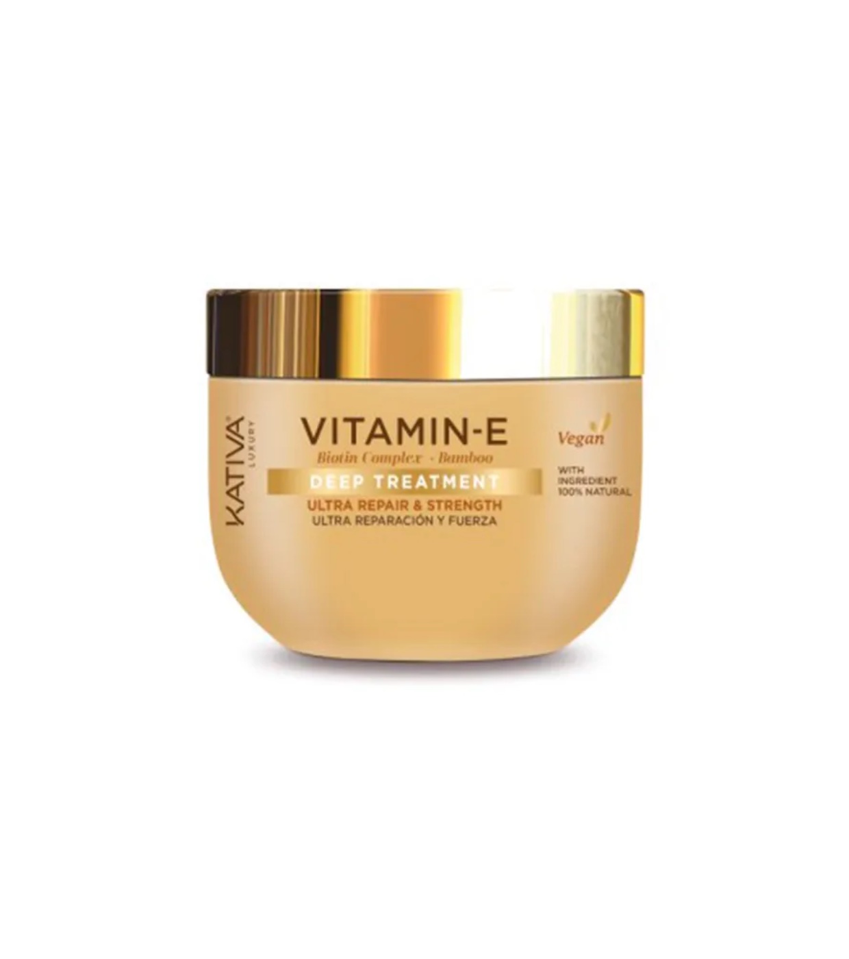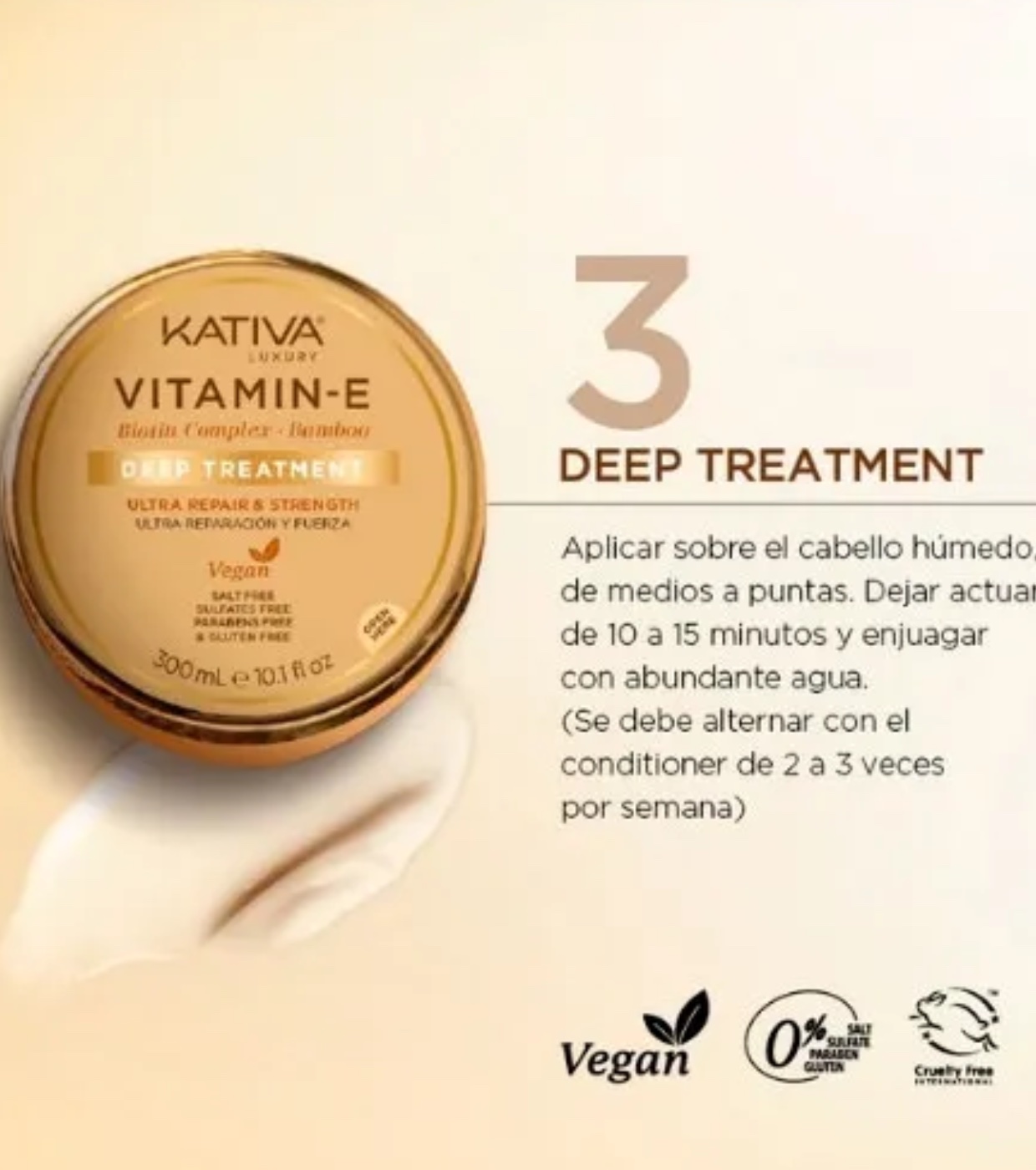 Le masque Kativa , enrichi en vitamine E, en complexe de biotine et en bambou, est formulé pour réparer, renforcer et protéger les cheveux contre les effets du temps, du stress et de l'exposition au soleil, facteurs qui entraînent une perte de vitalité et de brillance.