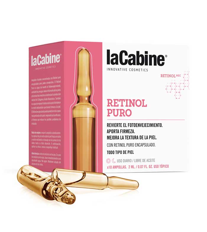 Ampoules concentrées pour le visage avec du rétinol pur encapsulé qui inversent le photo-vieillissement et améliorent la texture de la peau tout en maintenant l'équilibre de la matrice extracellulaire, apportant fermeté et stimulant la synthèse de collagène et d'acide hyaluronique.