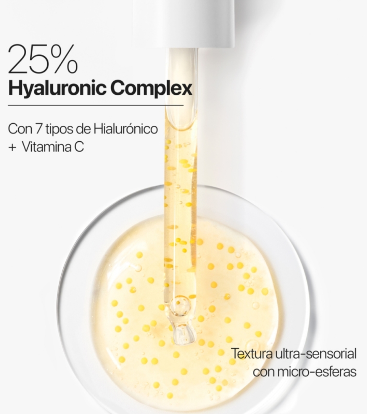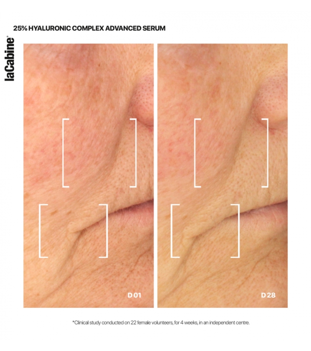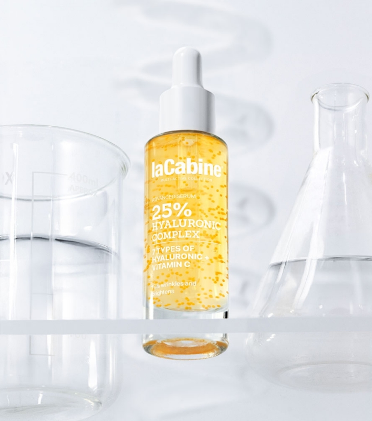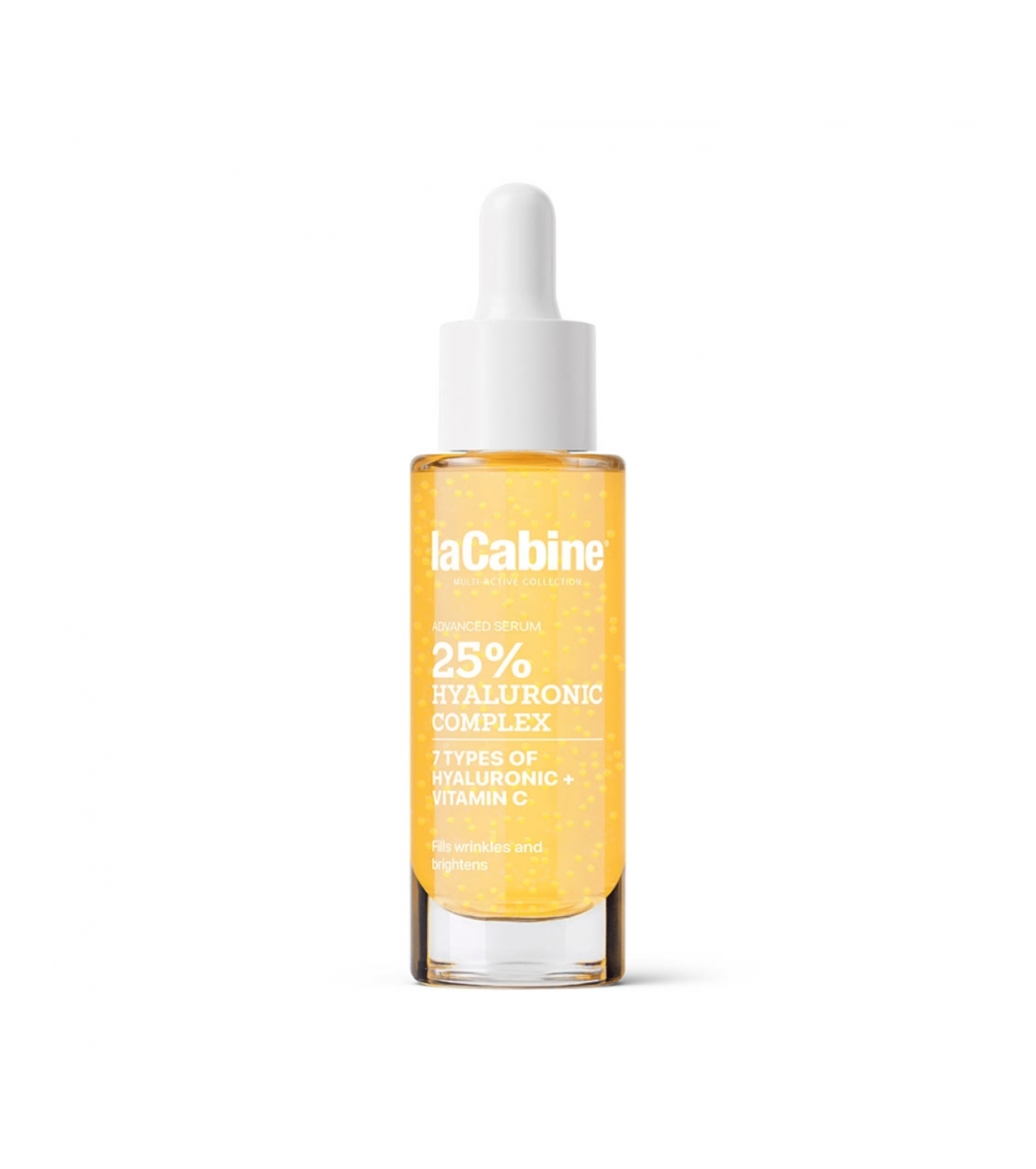 Ce sérum avancé 25% Hyaluronic Complex de La Cabine associe un complexe à 25% de 7 types d'Acide Hyaluronique à de la Vitamine C stabilisée pour une action complète : il comble les rides, hydrate en profondeur et illumine la peau dès la première application.