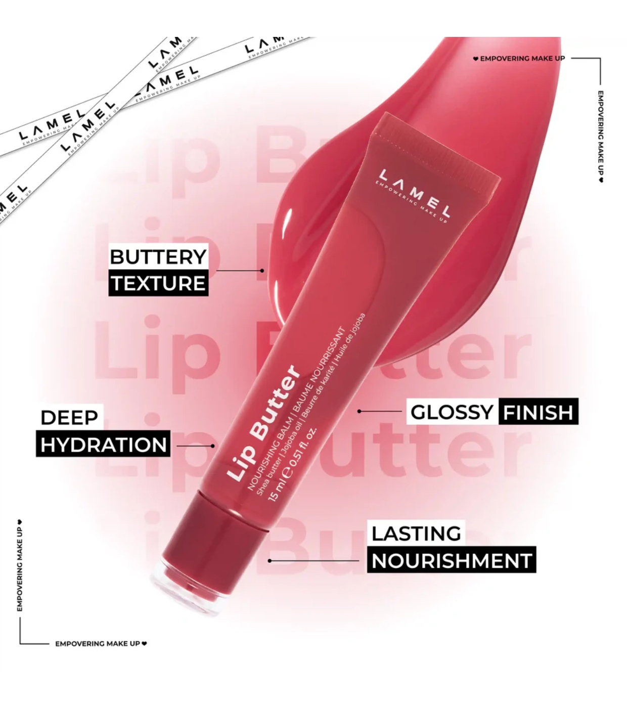 Profitez de lèvres douces et nourries avec une brillance spectaculaire grâce à ce baume à lèvres Butter de Lamel , votre allié parfait pour une bouche irrésistible au quotidien.