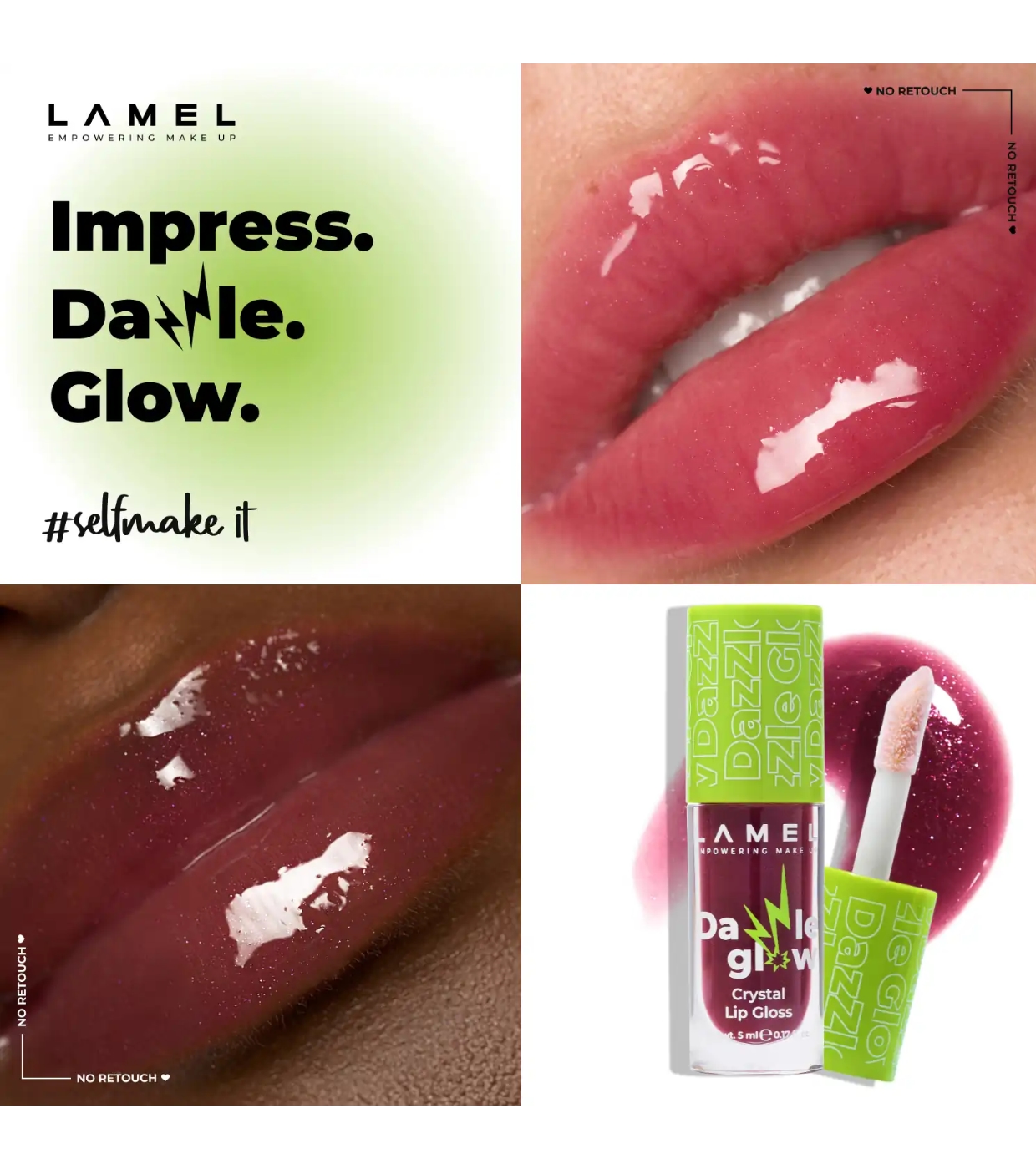 Préparez-vous pour des lèvres irrésistibles avec le Dazzle Glow Crystal Lip Gloss de Lamel , un brillant à lèvres qui rehausse instantanément n'importe quel look.