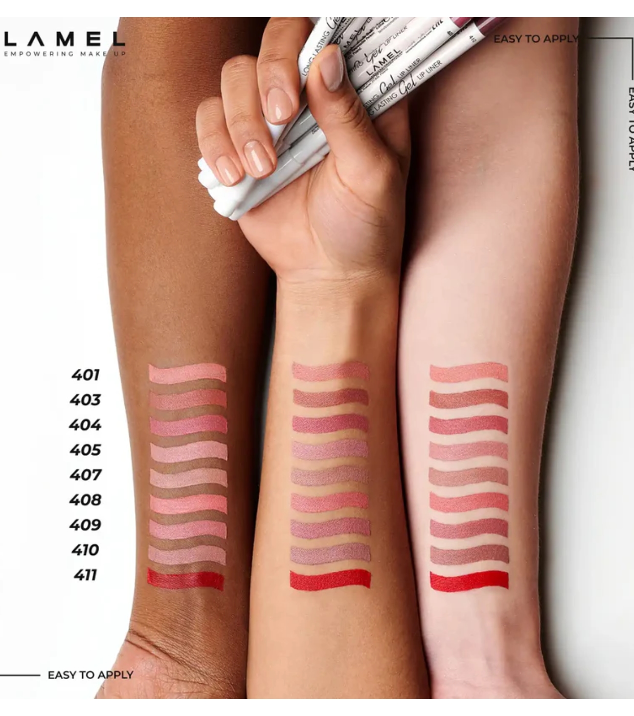 Le crayon à lèvres gel longue tenue de Lamel a une consistance de gel délicate qui assure une application uniforme et précise, restant en place toute la journée.