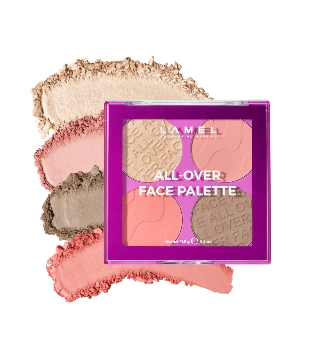 La palette All-Over Face de Lamel comprend un enlumineur, un produit de contouring et deux teintes de blush.