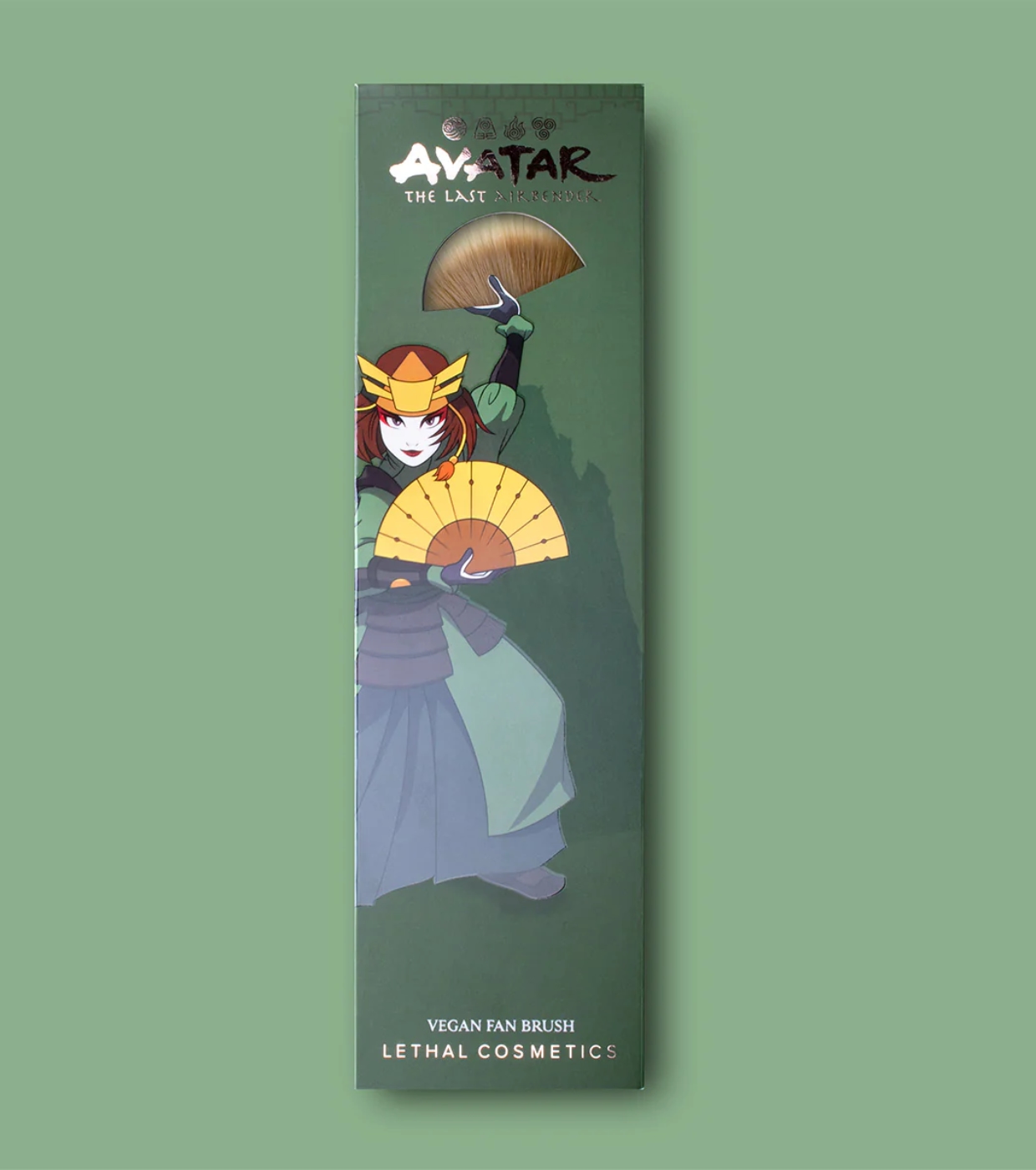 Un pinceau illuminateur Suki Fan de Lethal Cosmetics inspiré de la légendaire guerrière Kyoshi et de ses éventails de guerre emblématiques, conçu pour unir beauté, précision et caractère.