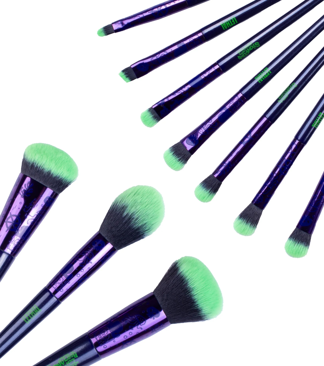 Elle comprend 10 pinceaux végétaliens dont les poils présentent un dégradé du vert au noir, des détails de marque en feuille vert fluo et un design exclusif qui reflète l'obscurité et le mystère des Enfers, offrant une finition luxueuse et de haute qualité.