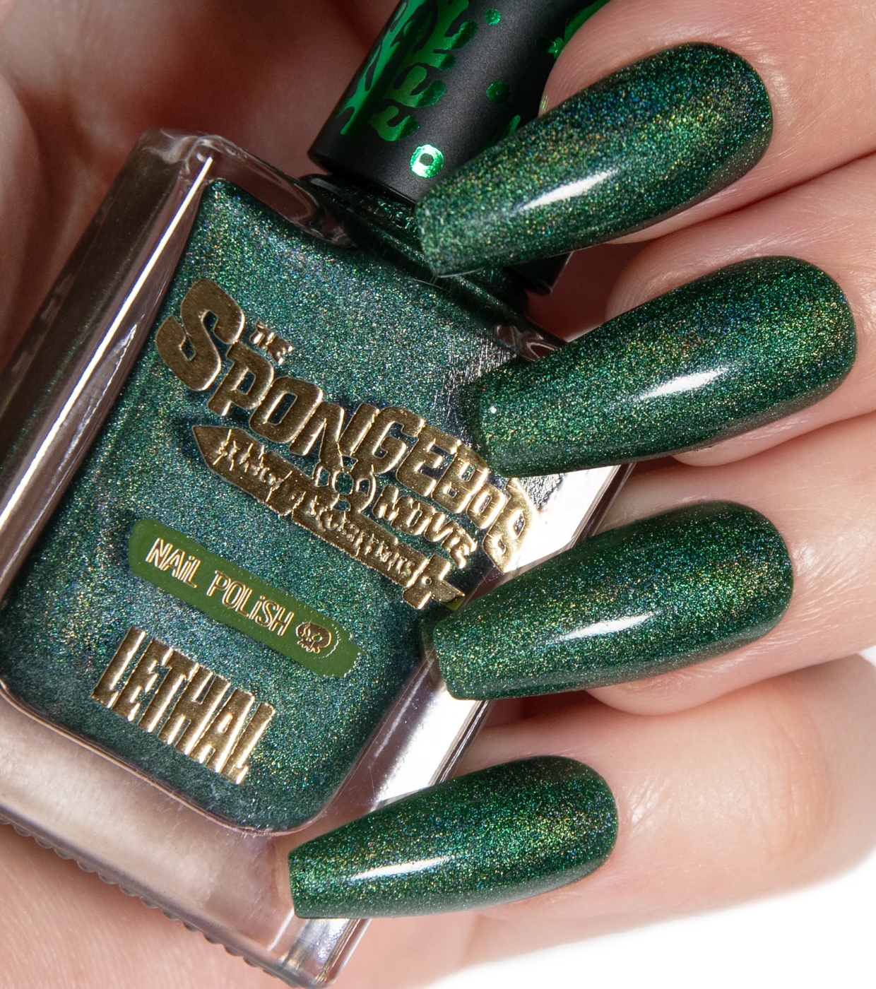 Lumineuse, audacieuse et sans complexe. Barb de Lethal Cosmetics est un vernis à ongles holographique linéaire d'un vert profond qui reflète des paillettes arc-en-ciel, comme la lumière du soleil dansant à la surface de l'océan.