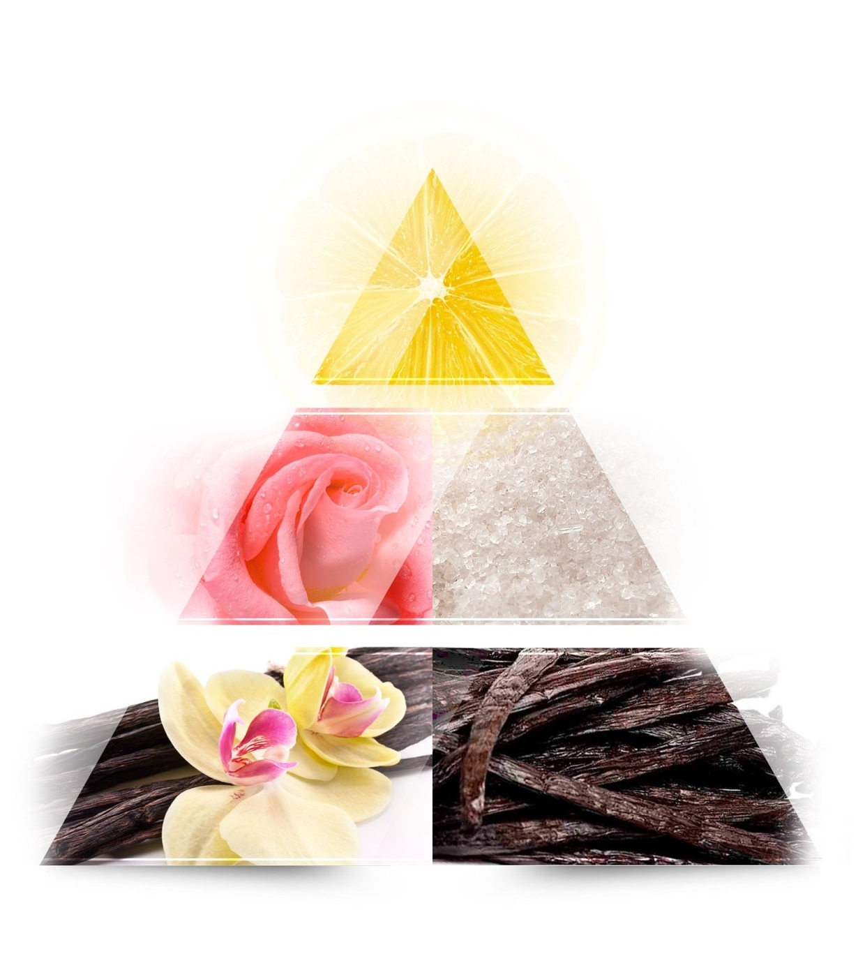 Son ouverture fraîche aux notes de citron apporte luminosité et légèreté, laissant place à un cœur où la rose est enveloppée d'un accord sucré qui apporte une touche douce et sophistiquée.