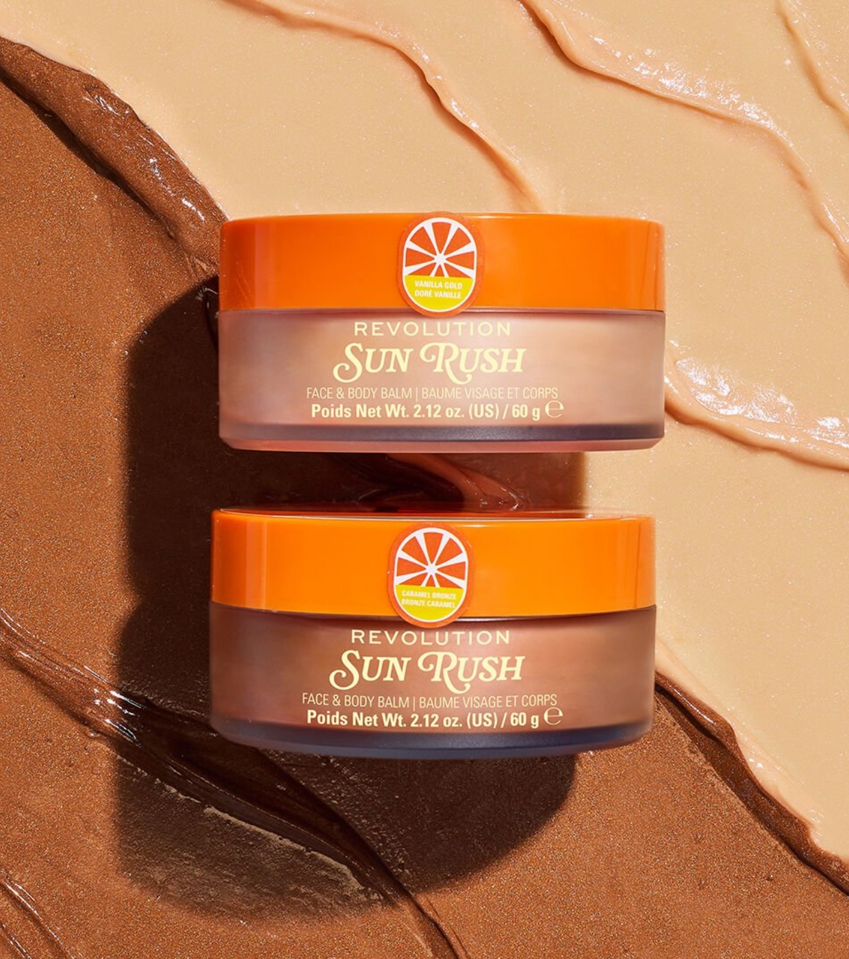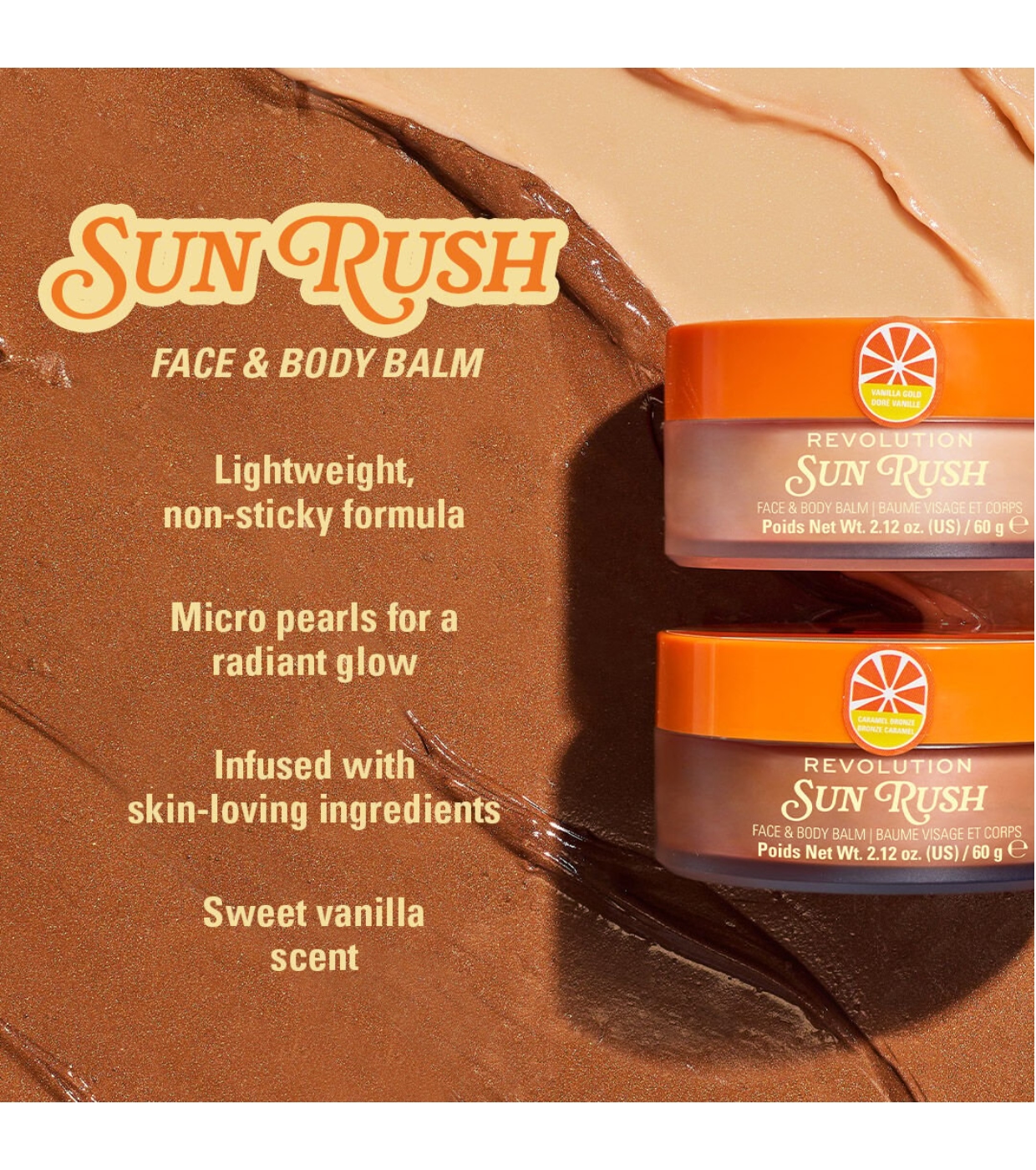Obtenez un éclat radieux sur votre visage et votre corps avec le baume corporel illuminateur Sun Rush de Revolution..
