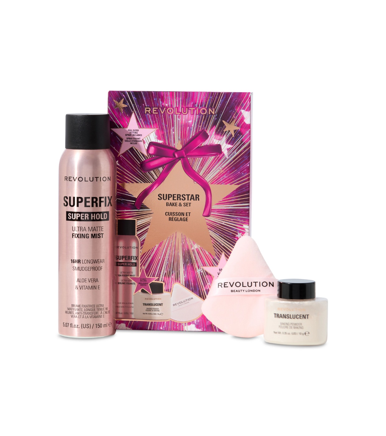 REVOLUTION SUPERFIX FIXING SPRAY (INGREDIENTS): AQUA (WATER, EAU), ALCOHOL DENAT., VP/VA COPOLYMER, PROPYLENE GLYCOL, PHENOXYETHANOL, PEG-40 HYDROGENATED CASTOR OIL, PARFUM (FRAGRANCE), PANTHENOL, ETHYLHEXYLGLYCERIN, TOCOPHERYL ACETATE, ALOE BARBADENSIS LEAF JUICE, GLYCERIN, POTASSIUM SORBATE, ALPHA-ISOMETHYL IONONE, LINALOOL, CITRONELLOL, HEXYL CINNAMAL. REVOLUTION BAKING POWDER TRANSLUCENT MINI (INGREDIENTS): ALUMINUM STARCH OCTENYLSUCCINATE, MICA, SILICA, DIMETHICONE, AQUA (WATER, EAU), DIMETHICONE/VINYL DIMETHICONE CROSSPOLYMER, PHENOXYETHANOL, ETHYLHEXYLGLYCERIN, SODIUM HYALURONATE, CI 77491 (IRON OXIDES), CI 77492 (IRON OXIDES), CI 77499 (IRON OXIDES).