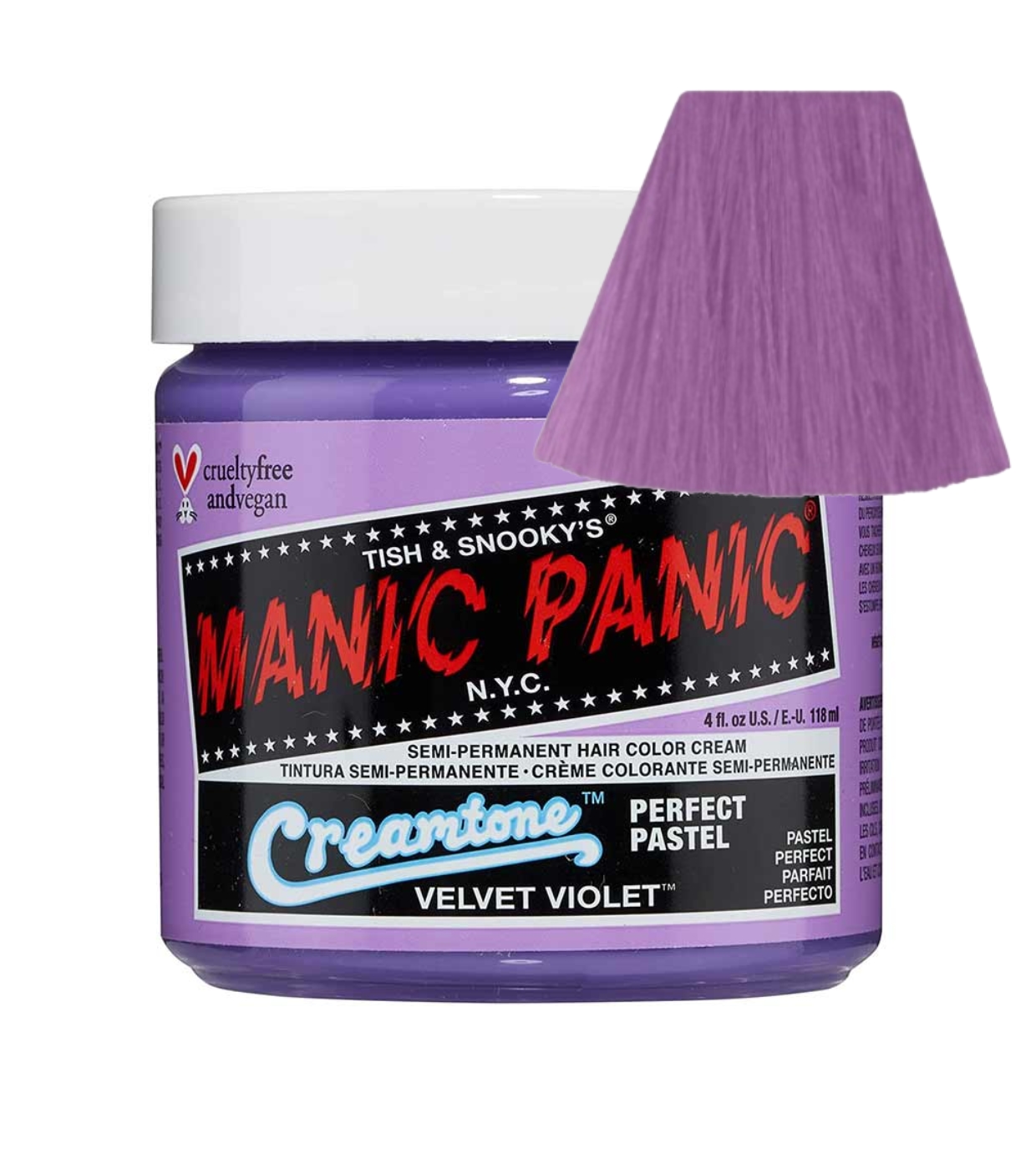 La Manic Panic High Voltage dans la teinte Velvet Violet est une teinture capillaire semi-permanente végane à effet fantaisie avec un fini mauve violet pastel doux.