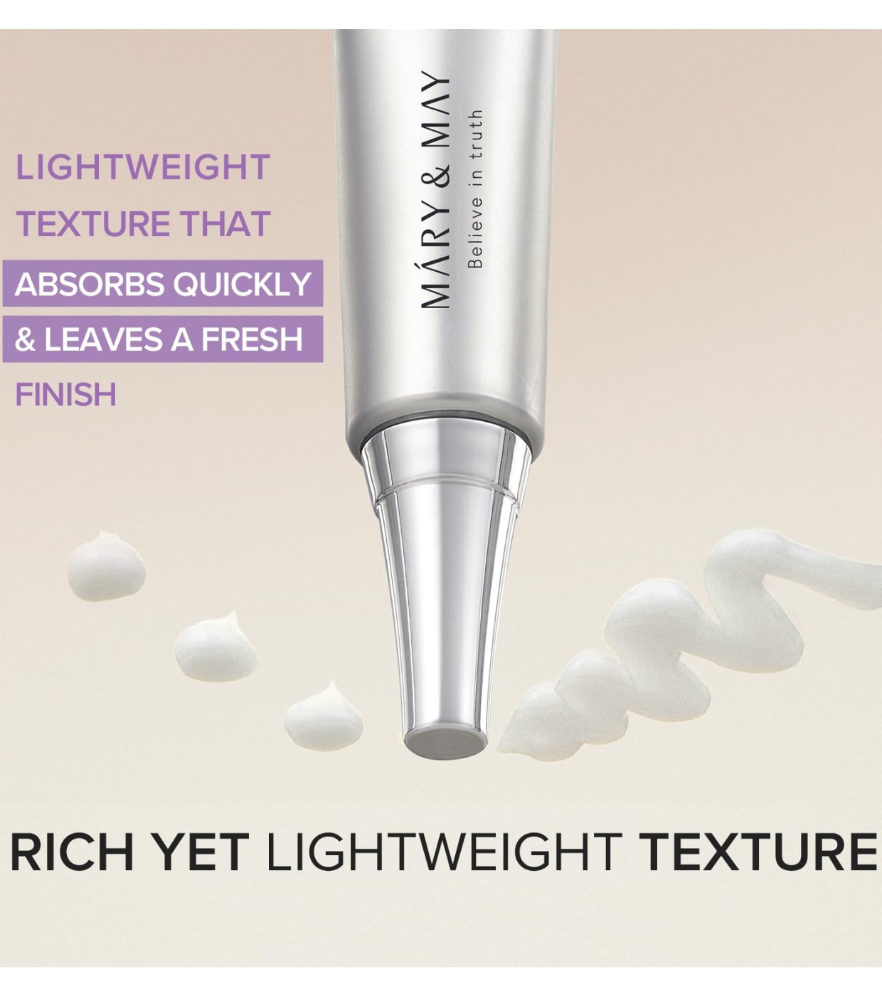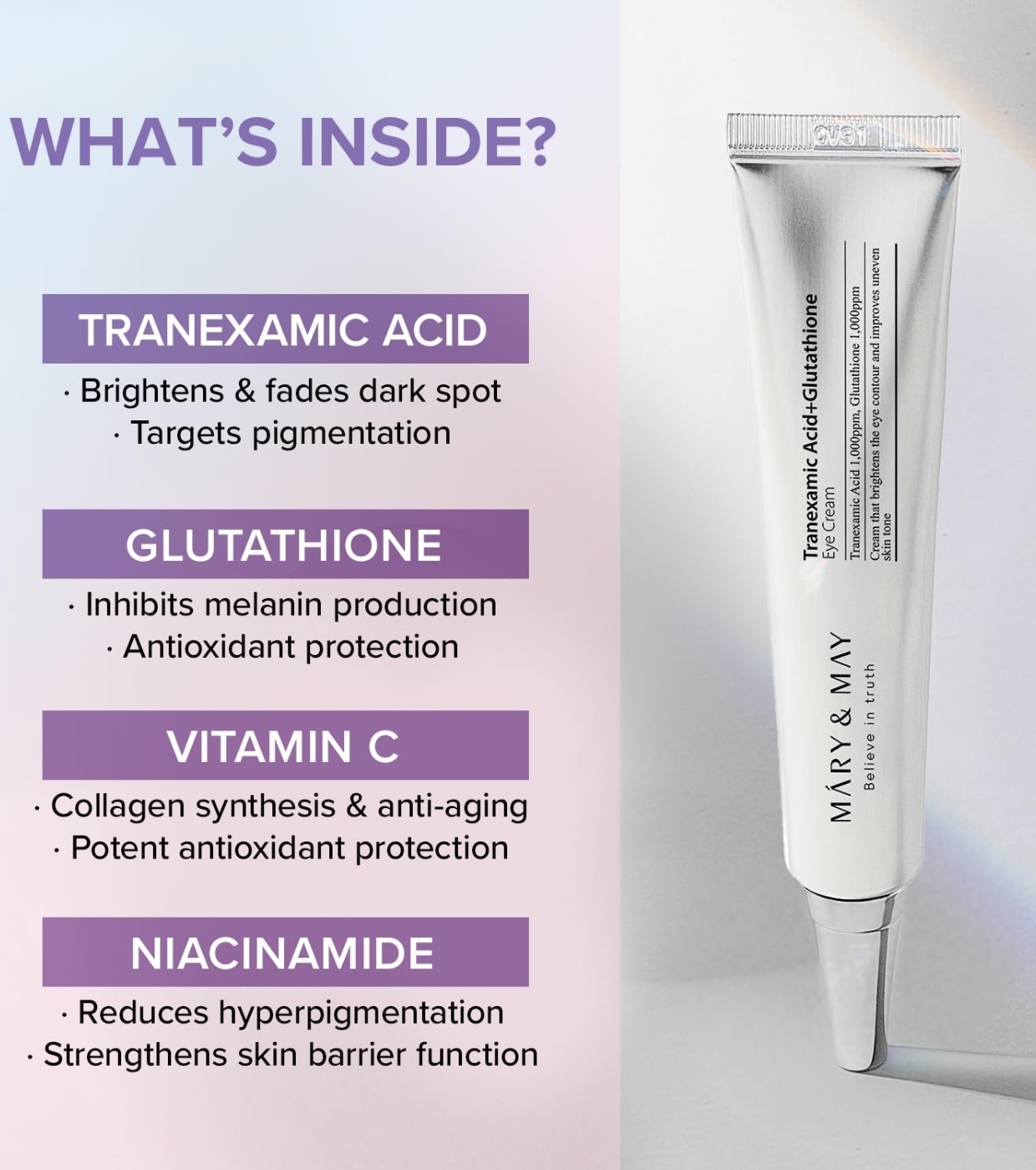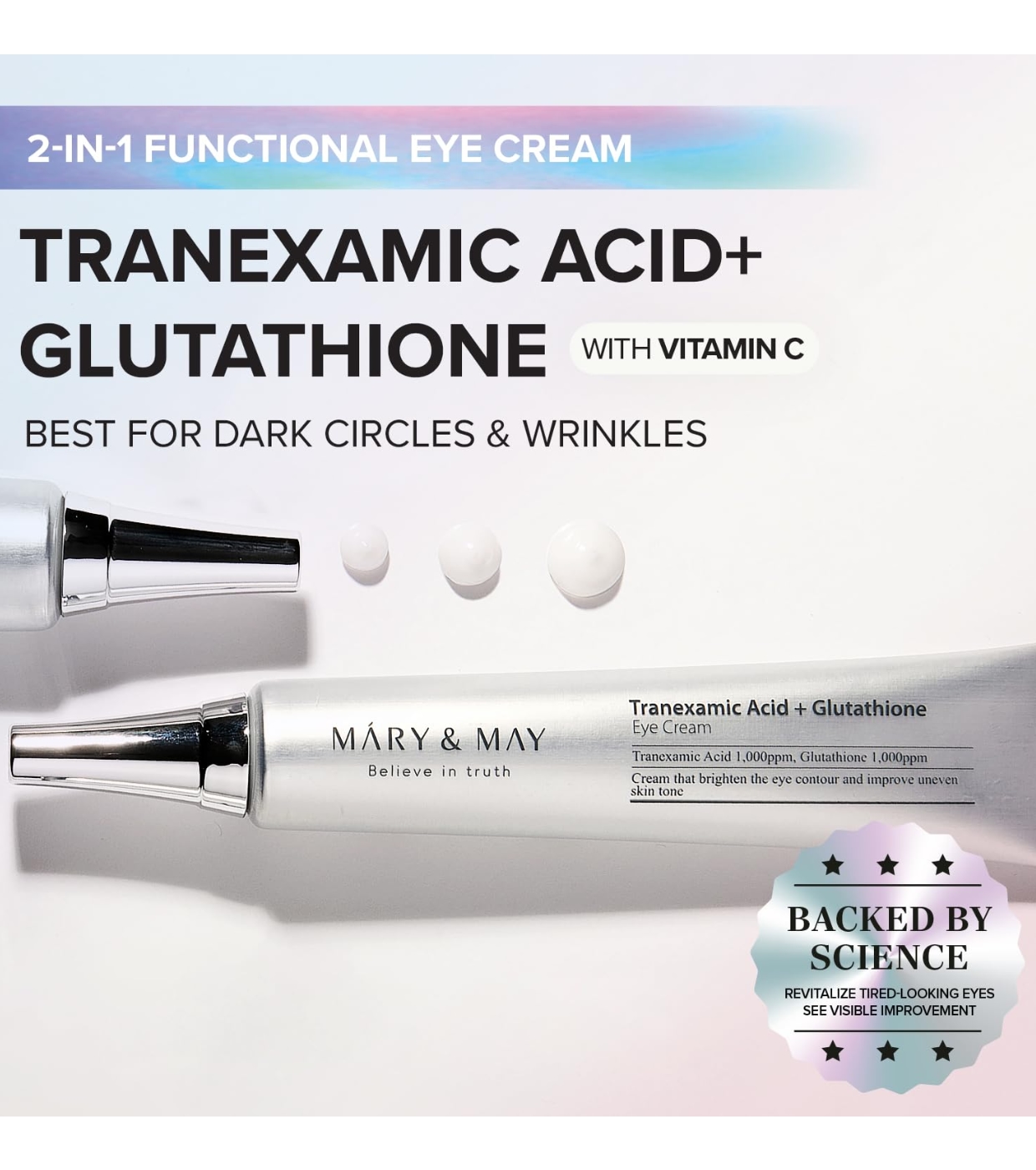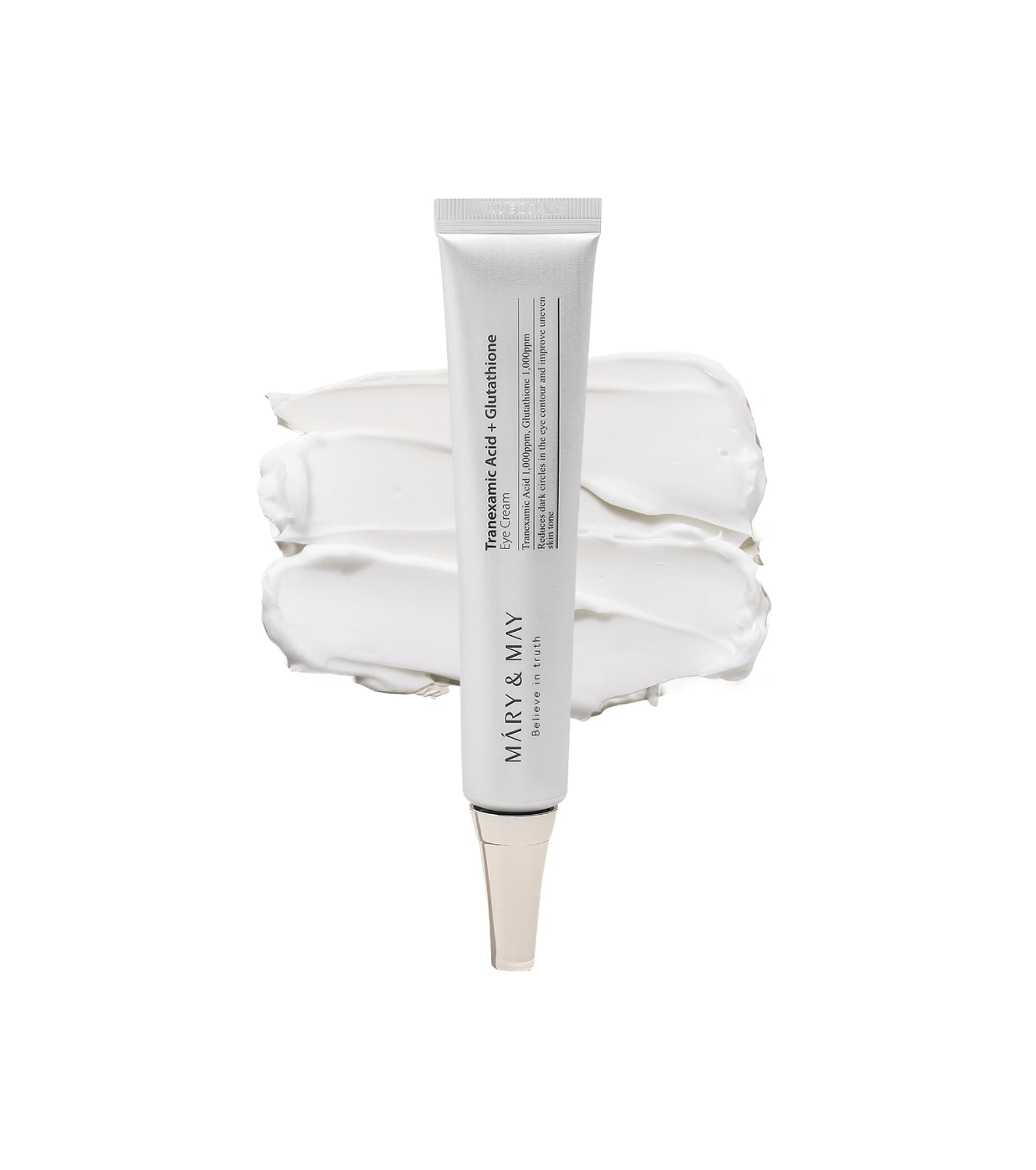 Redonnez de l'éclat à votre regard avec Mary&May Tranexamic Acid + Glutathione Eye Cream , un soin contour des yeux intensif formulé avec de l'acide tranexamique et du glutathion.