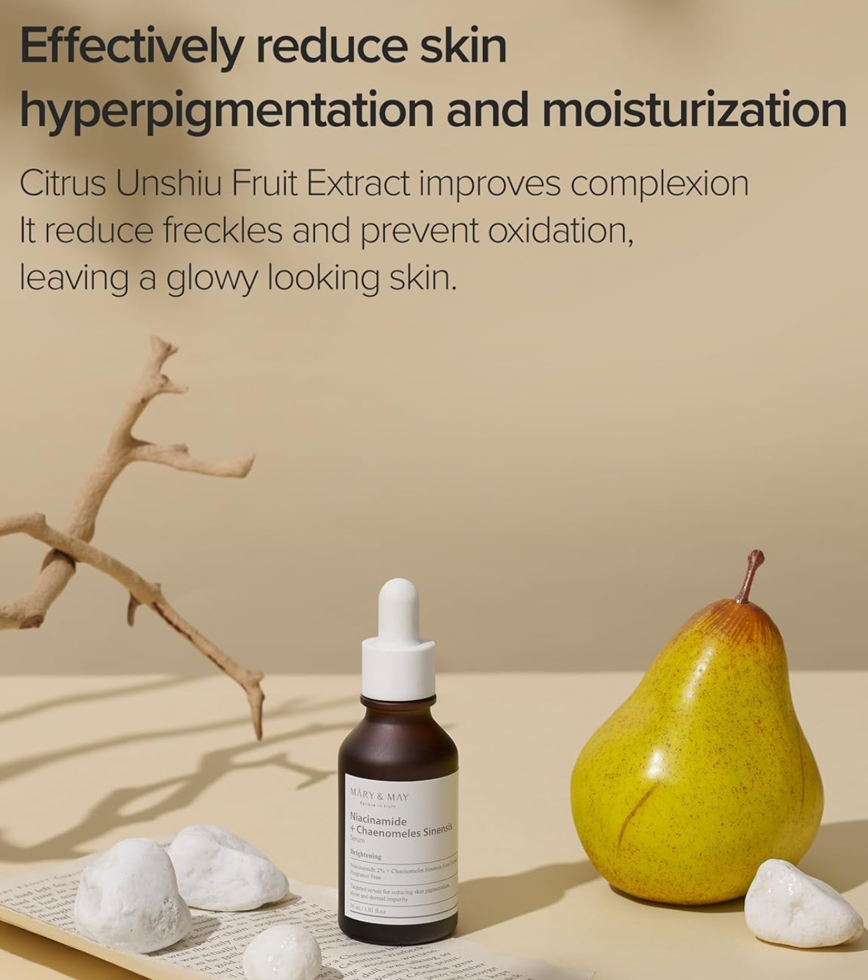 Mary & May Niacinamide + Chaenomeles Sinensis Serum est un sérum pour le visage léger et à absorption rapide conçu pour améliorer l'éclat, équilibrer la peau et unifier le teint.