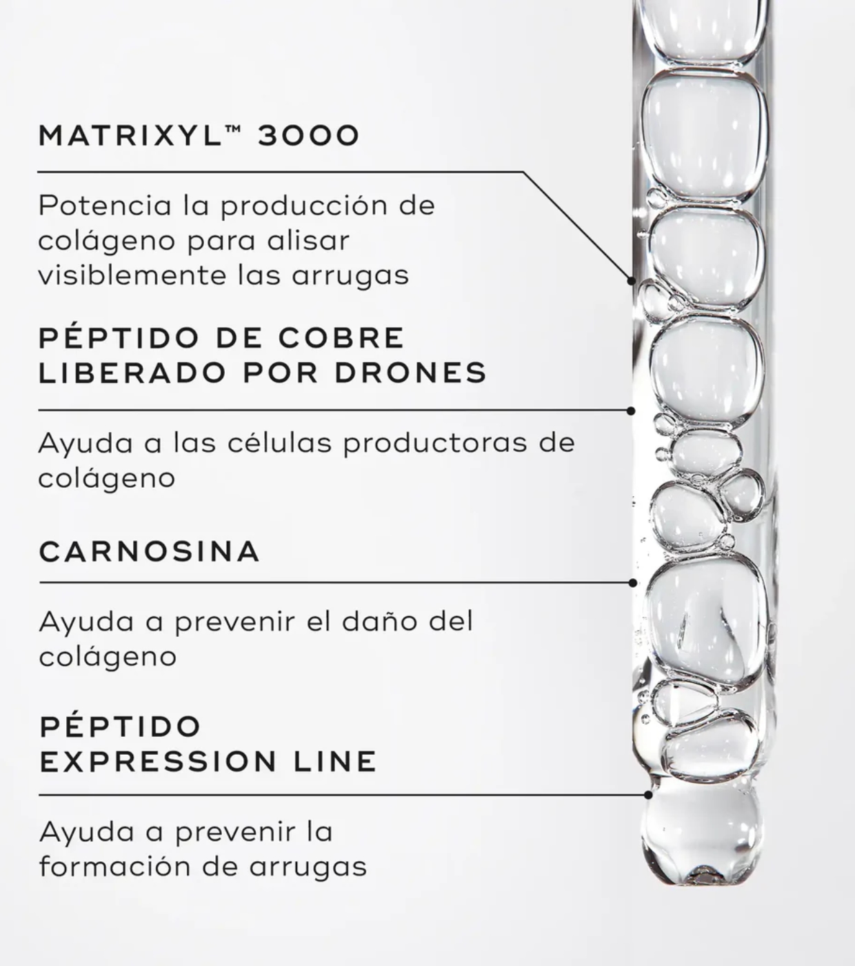 Aqua (Water), Glycerin, Butylene Glycol, Palmitoyl Tetrapeptide-7, Palmitoyl Tripeptide-1, Copper Heptapeptide-14 Pantothenate, Heptapeptide-15 Palmitate, Arginine/Lysine Polypeptide, Palmitoyl Tripeptide-38, Carnosine, Acetyl Hexapeptide-8, Pentapeptide-18, Palmitoyl Tripeptide-5, Tetrapeptide-21, Sodium Hyaluronate, Inulin, Alpha-Glucan Oligosaccharide, Lactic Acid/Glycolic Acid Copolymer, Panthenol, Ethylhexylglycerin, Hydroxypropyl Cyclodextrin, Dunaliella Salina (Green Algae) Extract, Polysorbate 20, Caprylyl Glycol, Citric Acid, Glyceryl Caprylate, Pantolactone, Phenylpropanol, Polyvinyl Alcohol, Carbomer, Potassium Sorbate, Sodium Benzoate, Sorbic Acid, Phenoxyethanol, Xanthan Gum.