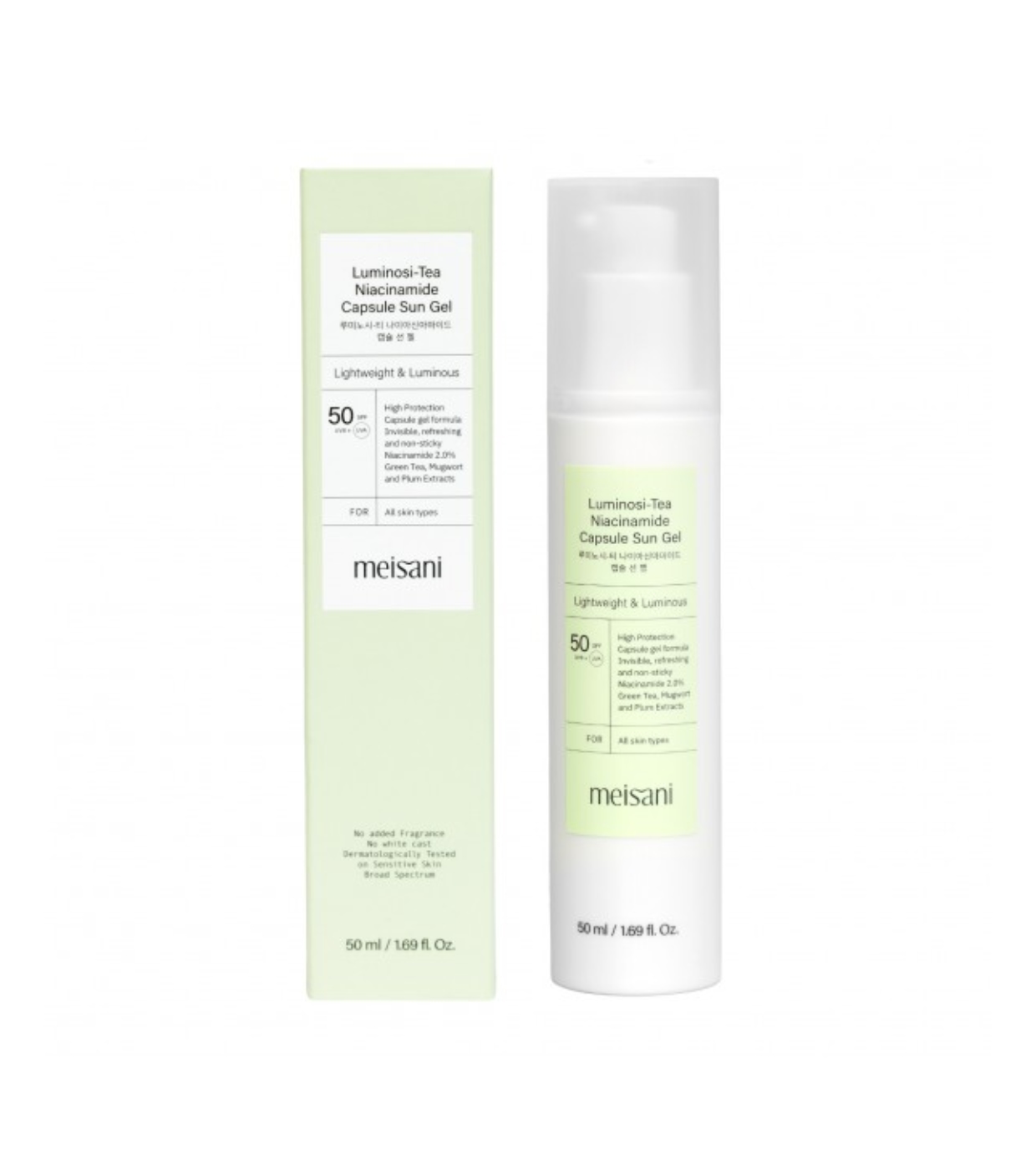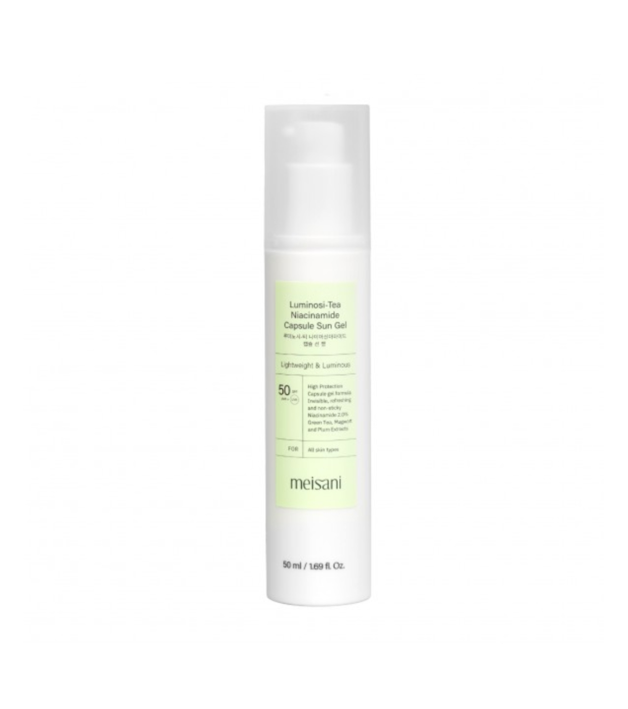 Luminosi-Tea Niacinamide Capsule Sun Gel SPF 50 est un gel solaire ultra-léger qui offre une protection élevée à large spectre (UVA/UVB) et un fini lumineux, hydratant et confortable.