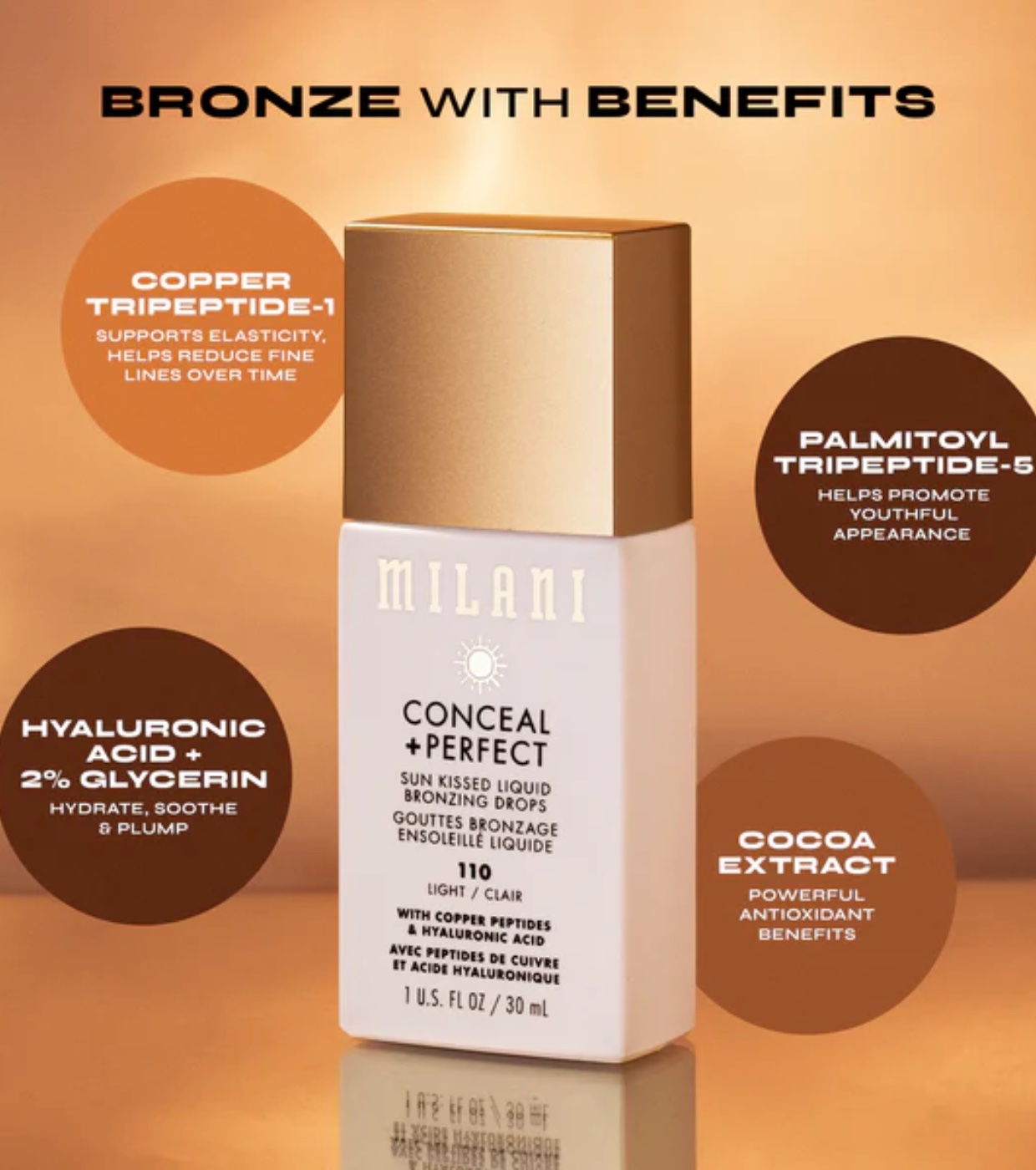 Obtenez cet éclat avec les gouttes bronzantes liquides Milani Milani Milani, qui offrent une couverture transparente, légère et ultra-estompable, une hydratation sérieuse et un éclat de vacances (plage ou pas, nous ne le dirons pas).