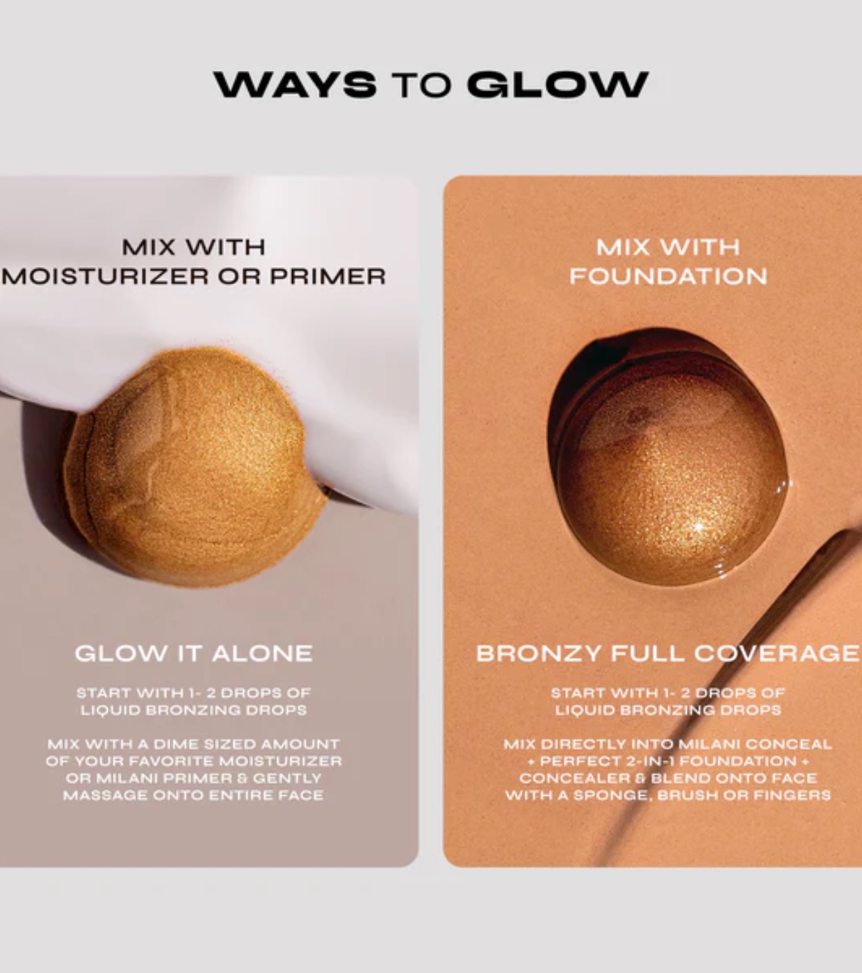 Mélangez 1 à 2 gouttes de produit dans une quantité de la taille d'une pièce de dix cents de votre crème hydratante préférée ou de votre base de teint Milani et mélangez avec vos doigts sur tout votre visage pour une base impeccable et éclatante.