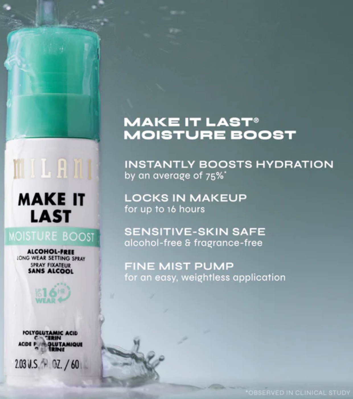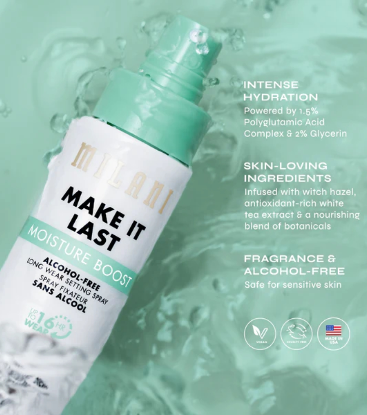 Bienvenue dans l'univers de l'hydratation longue durée ! Le spray fixateur de maquillage Make it Last Moisture Boost de Milani enrichit la collection iconique Make It Last d'une formule axée sur le soin de la peau.
