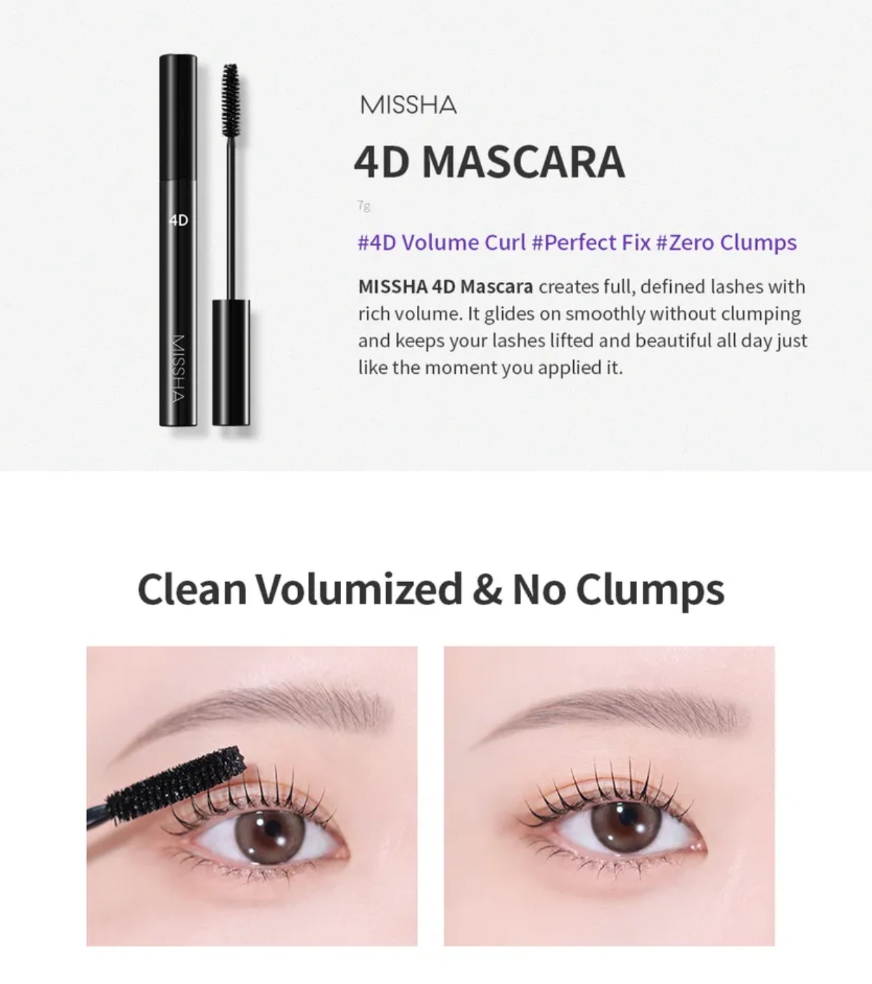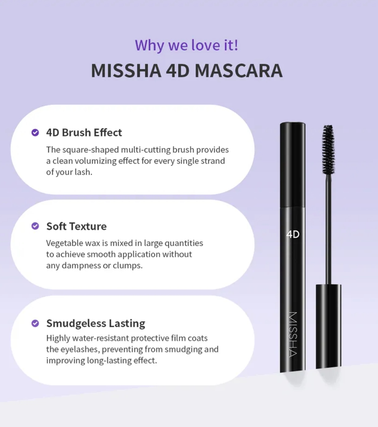 Le 4D Mascara de Missha est un mascara volumisant, idéal pour les cils fins ou clairsemés.