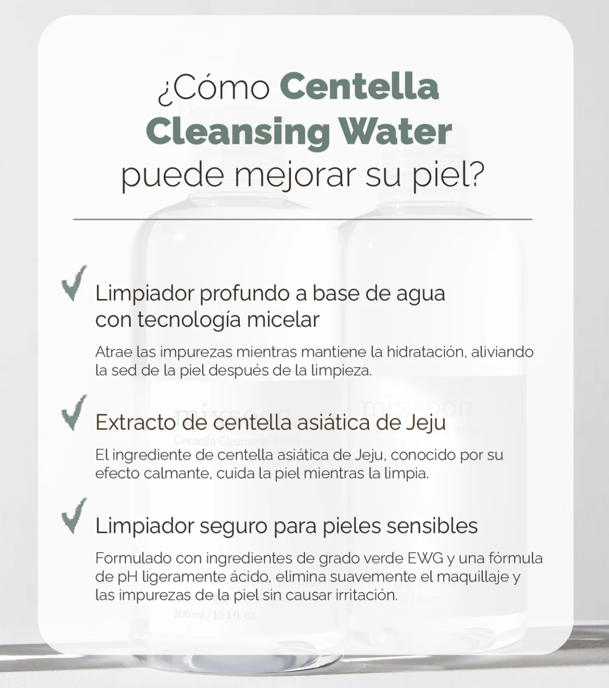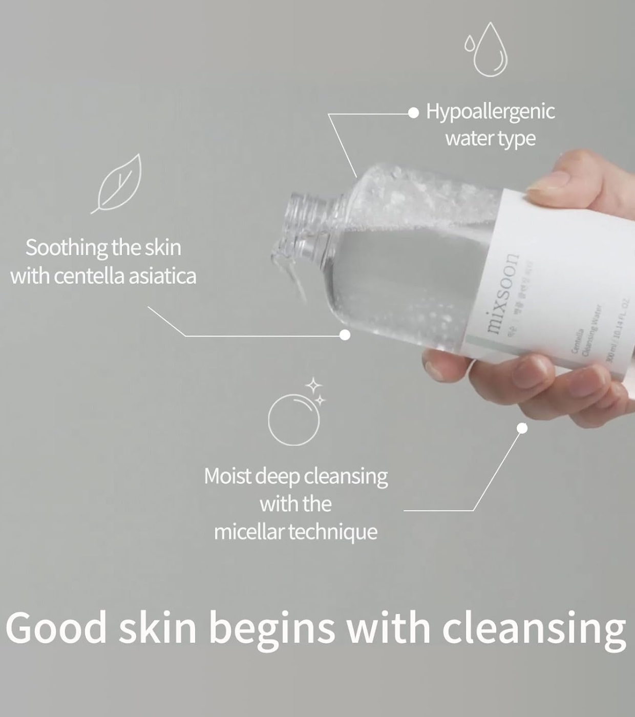 Découvrez Mixsoon Centella Cleansing Water , une eau nettoyante douce et rafraîchissante qui élimine efficacement le maquillage, les impuretés et l'excès de sébum sans irriter ni dessécher la peau.