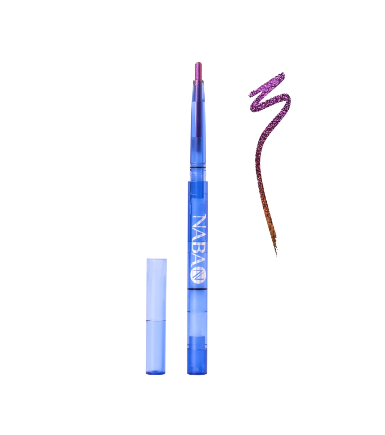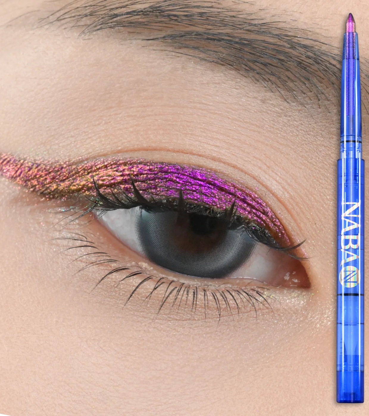 Naba Cosmetics Eyeliner gel multichrome hypnotique qui oscille entre le violet profond, le rose lumineux, l'or radieux et les nuances ocres chaudes.