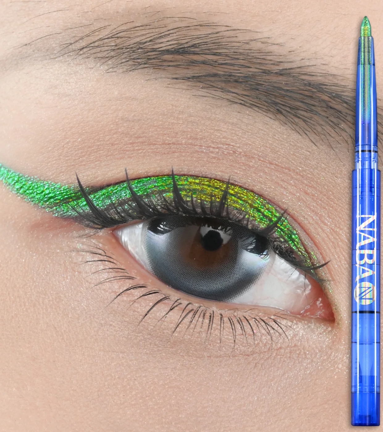 Naba Cosmetics L'eyeliner gel multichrome fait varier les nuances entre le vert herbe, le vert forêt, le turquoise, le bleu lac et le bleu profond.